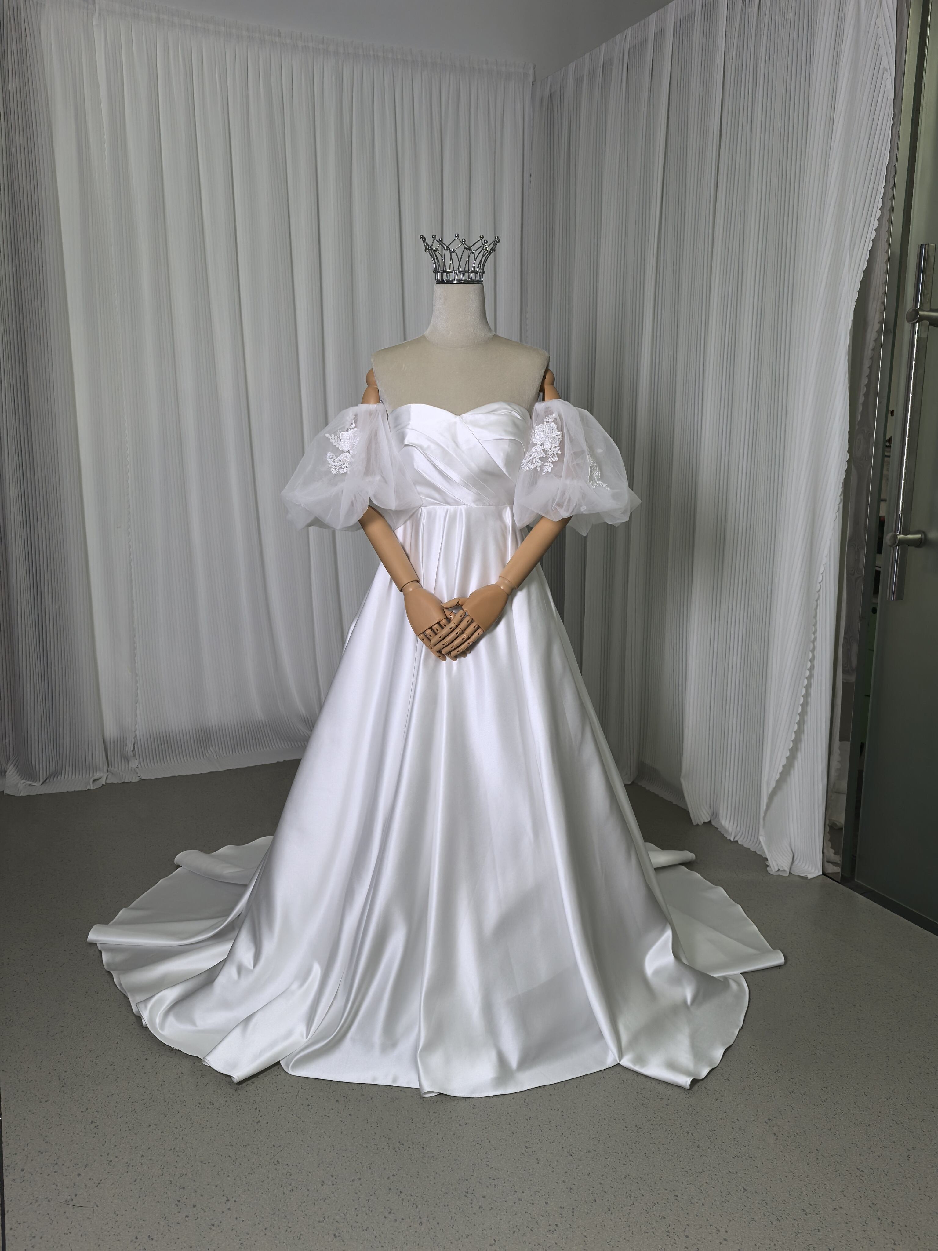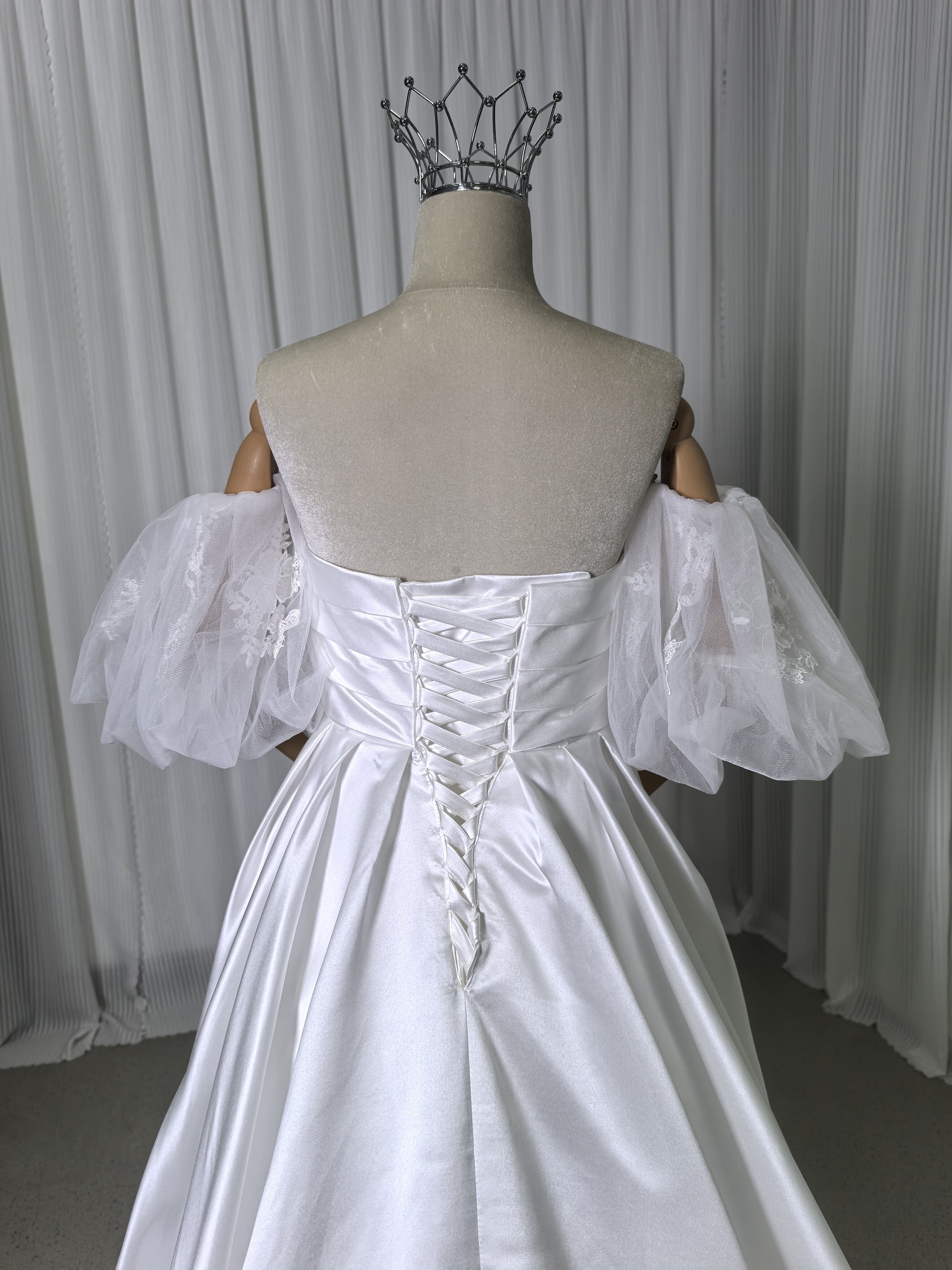ウェディングドレス ベアトップ 上品透け袖 光沢サテン 編み上げ 可愛い 花嫁