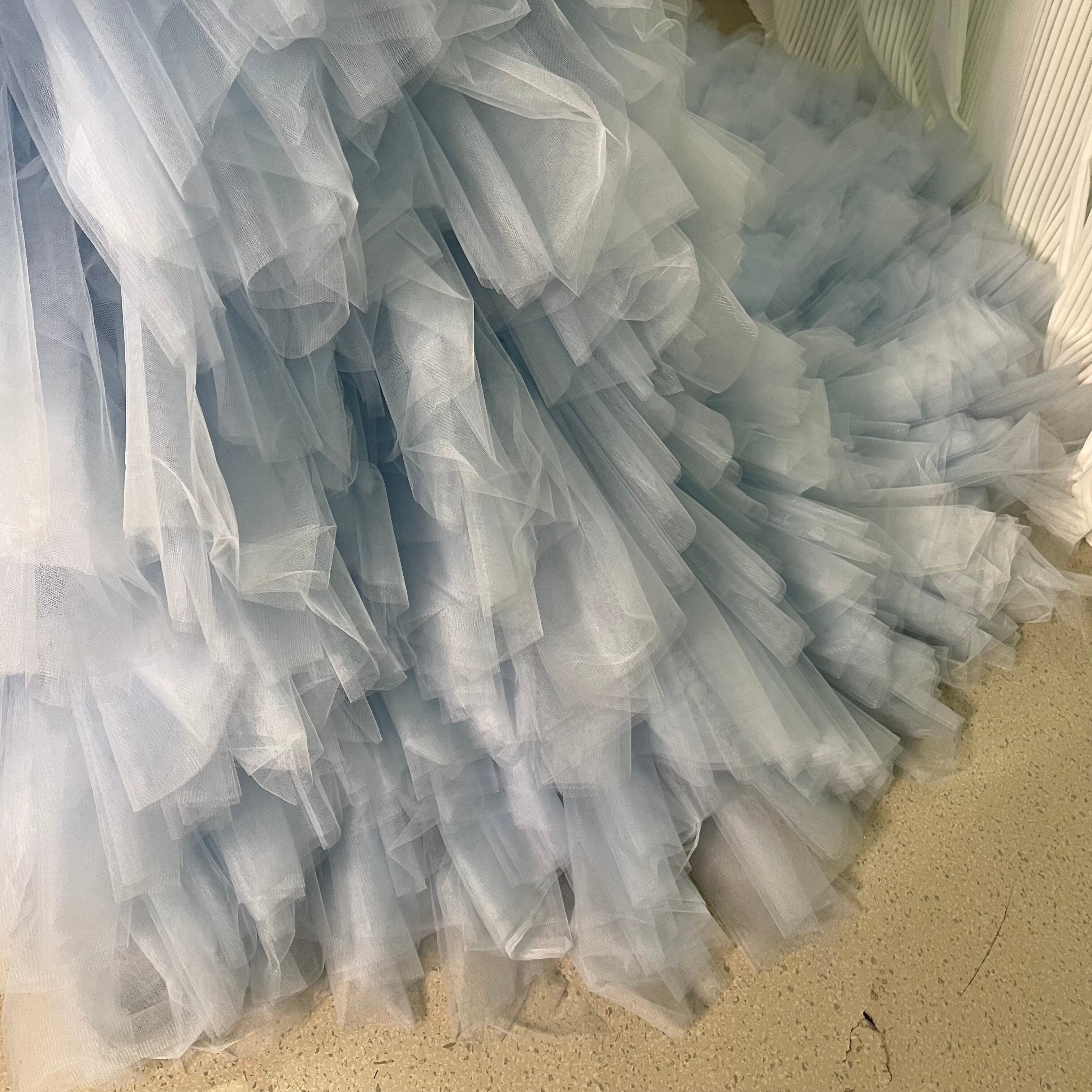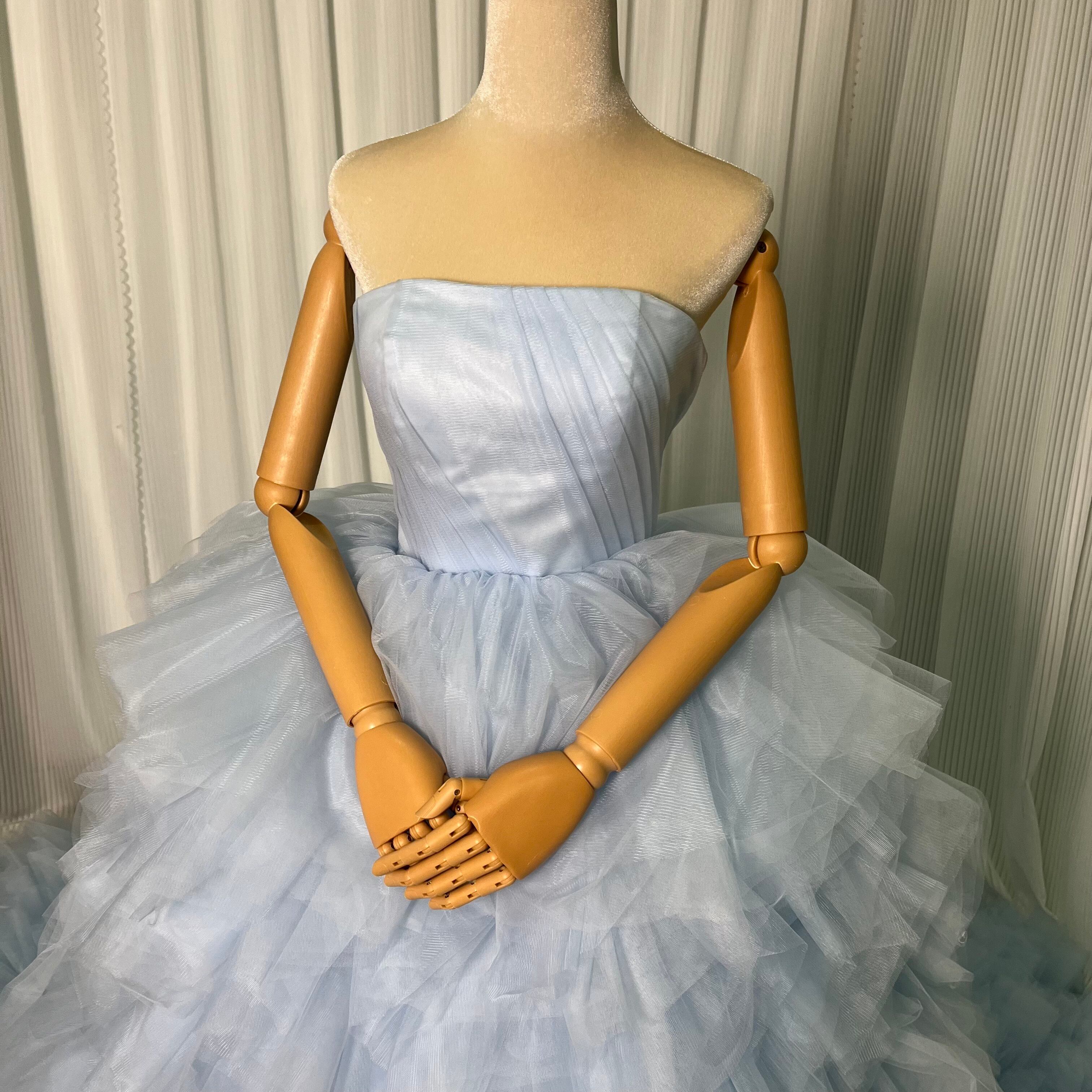 カラードレス 薄青 オフショルダー ソフトチュール ファスナー ボリュームドレス ラッフルフリル 披露宴 音楽会