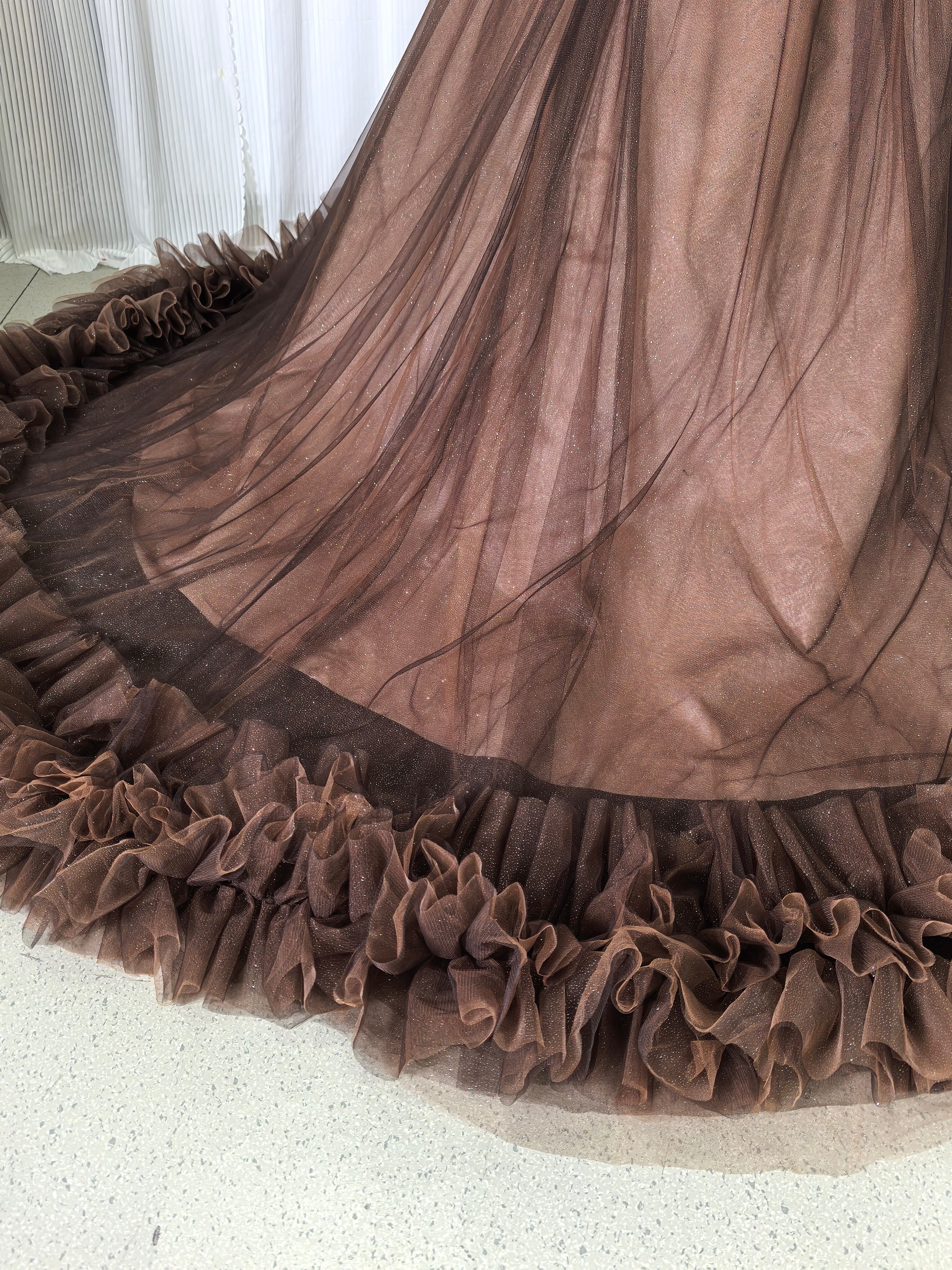 エレガント カラードレス コーヒーの色 ベアトップ ラッフルフリル キラキラチュール 花嫁