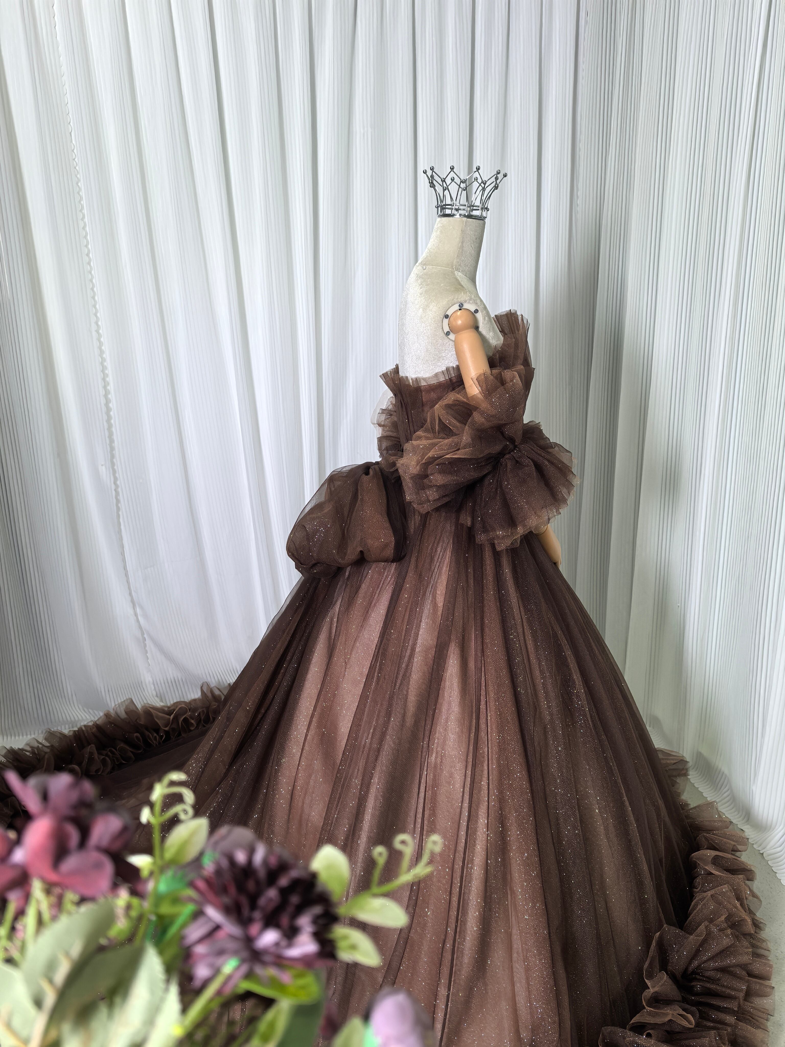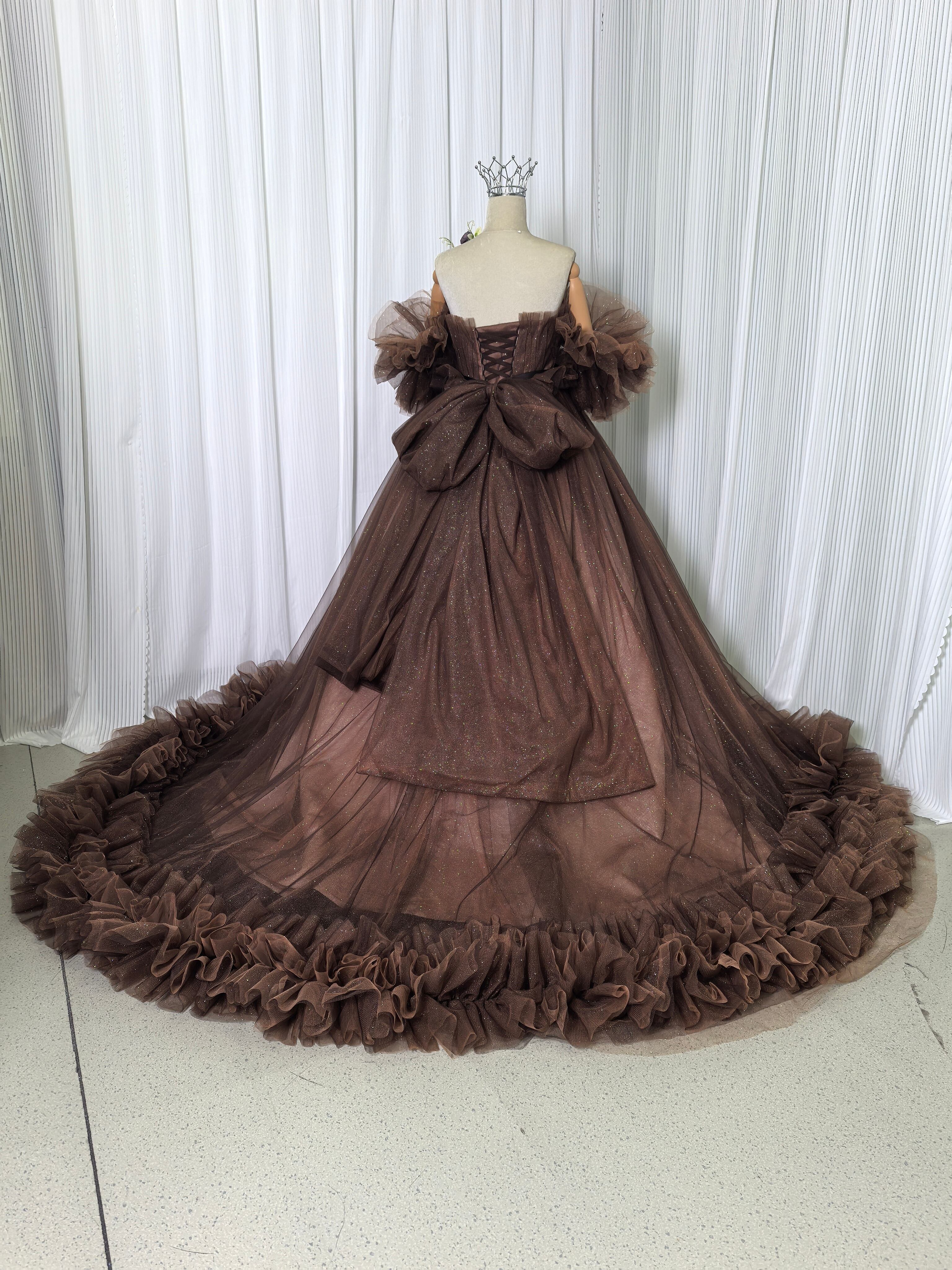 華やか カラードレス コーヒーの色 ベアトップ 姫袖 ラッフルフリル 豪華なバックリボン キラキラチュール 花嫁