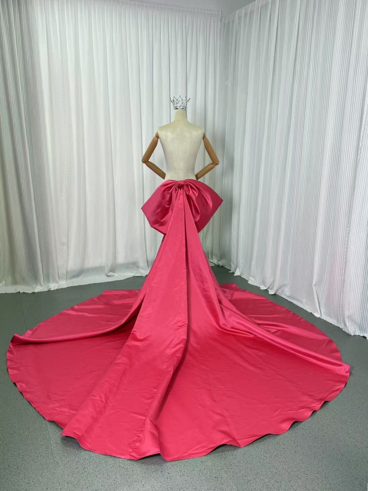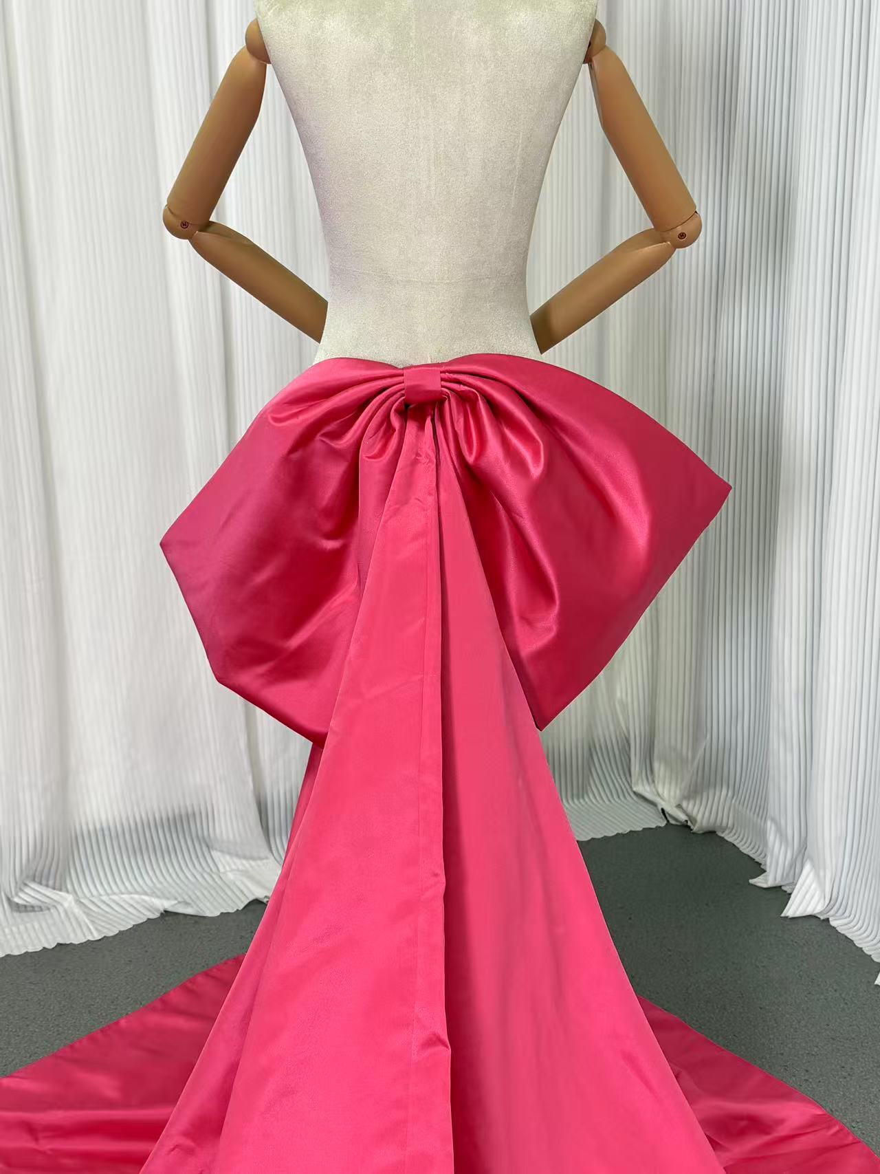 ビビッドピンク ふっくら柔らかなバックリボン 光沢サテン ロングトレーン