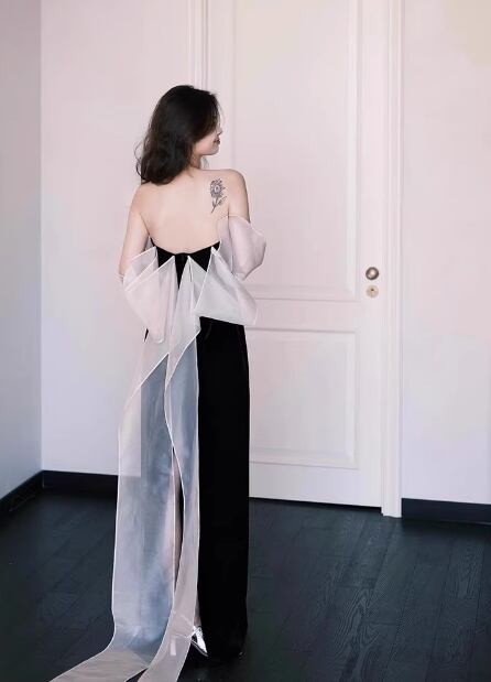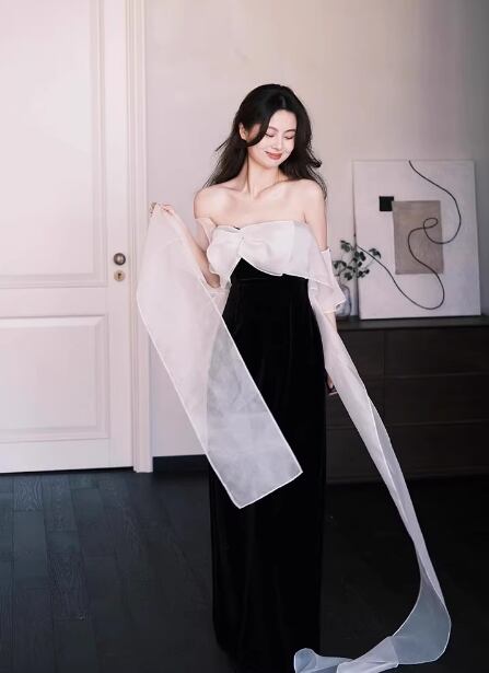 パーティードレス ブラック ビロード ふわふわリボン 揺らめく裾 演奏会/音楽会