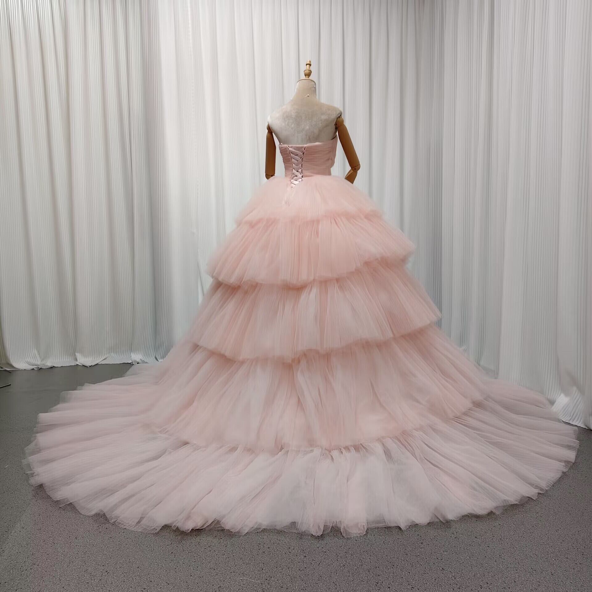 美品!カラードレス 薄ピンク ベアトップ プリーツスカート プリンセスライン 披露宴 花嫁