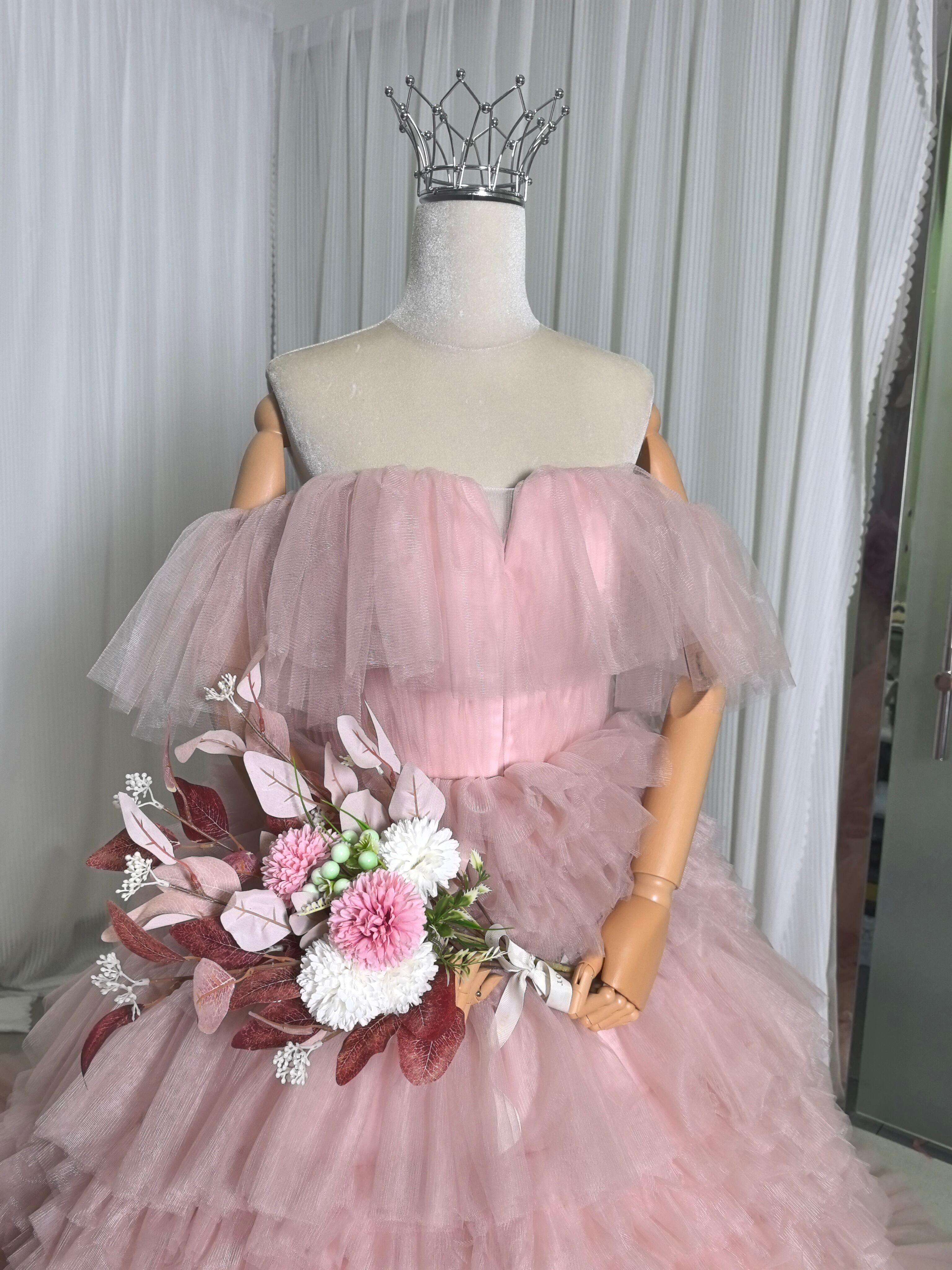 豪華!カラードレス ピンク オフショルダー 柔らかく重ねたチュールスカート ロングトレーン 前撮り