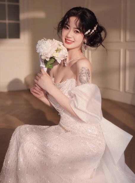 ウエディングドレス ベアトップ シークインチュール ふっくら柔らかなバックリボン 華やか 前撮り