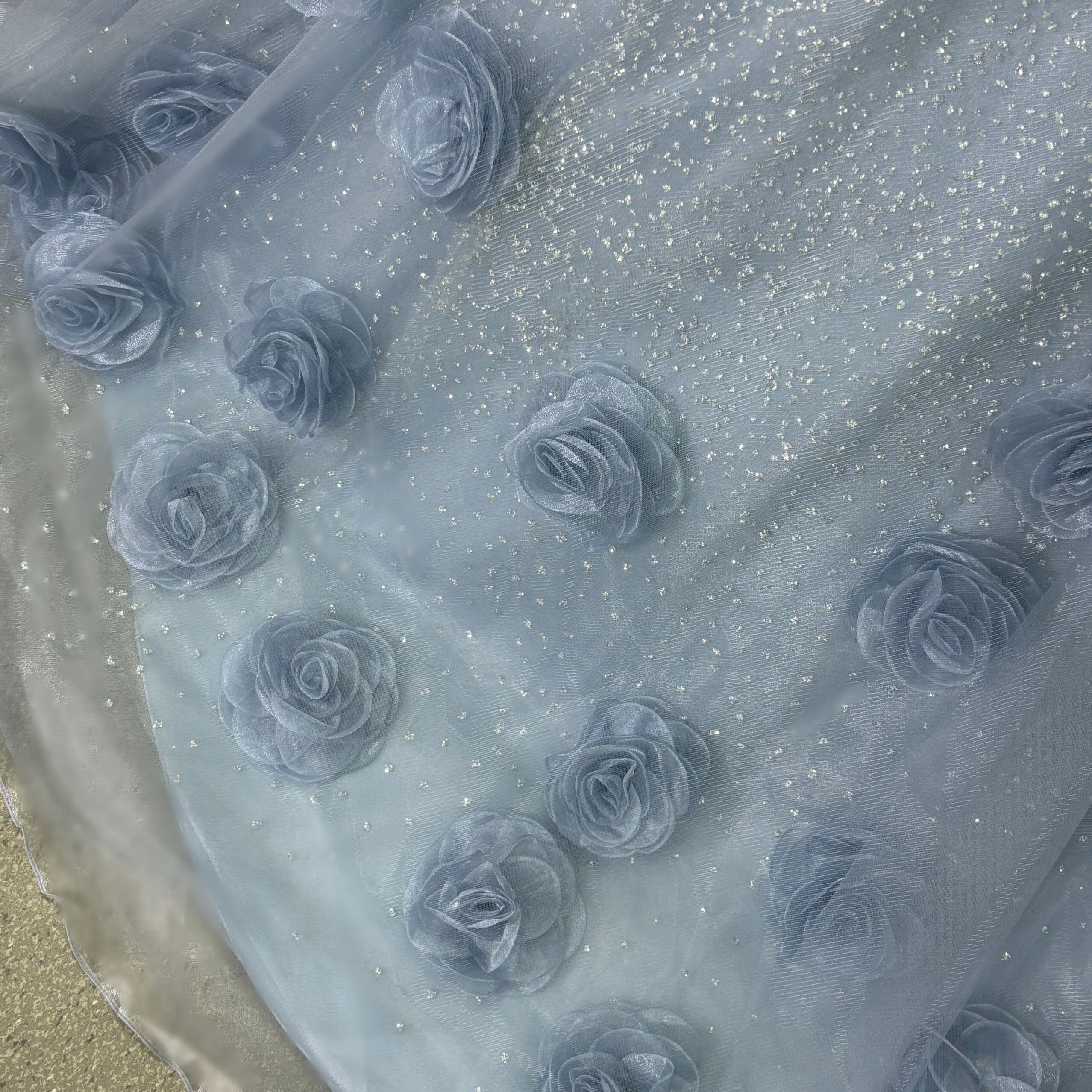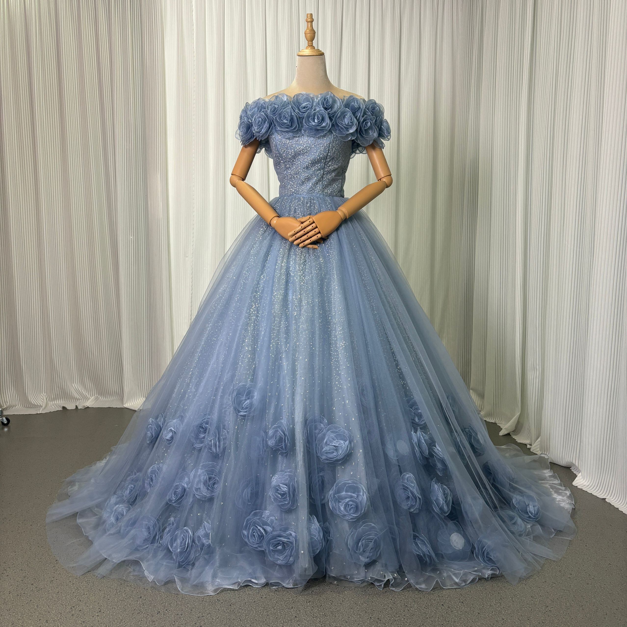 カラードレス ブルーグレー オフショルダー キラキラドレス バラトレーン 編み上げ 花嫁