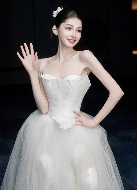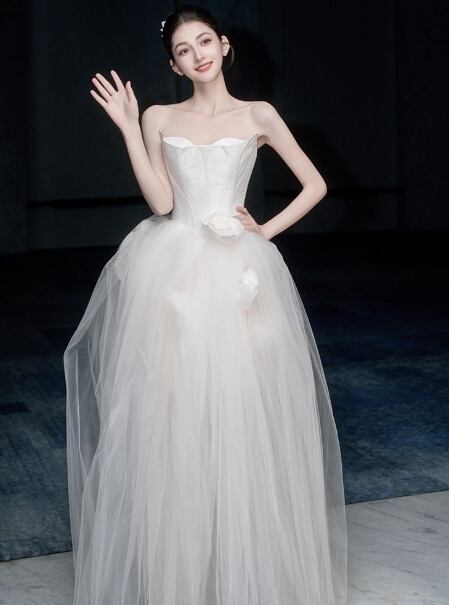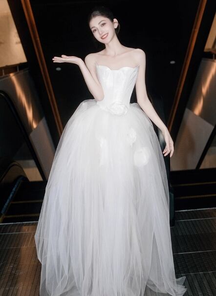 ウェディングドレス ベアトップ 花モチーフ ふわふわドレス 結婚式/披露宴