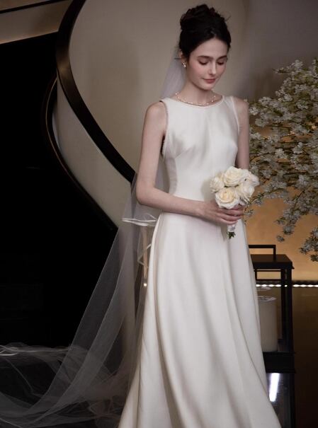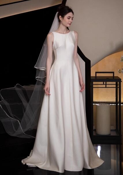 ウェディングドレス ノースリーブ ロイヤルサテン スレンダーライン 披露宴 抜群のおしゃれ見え