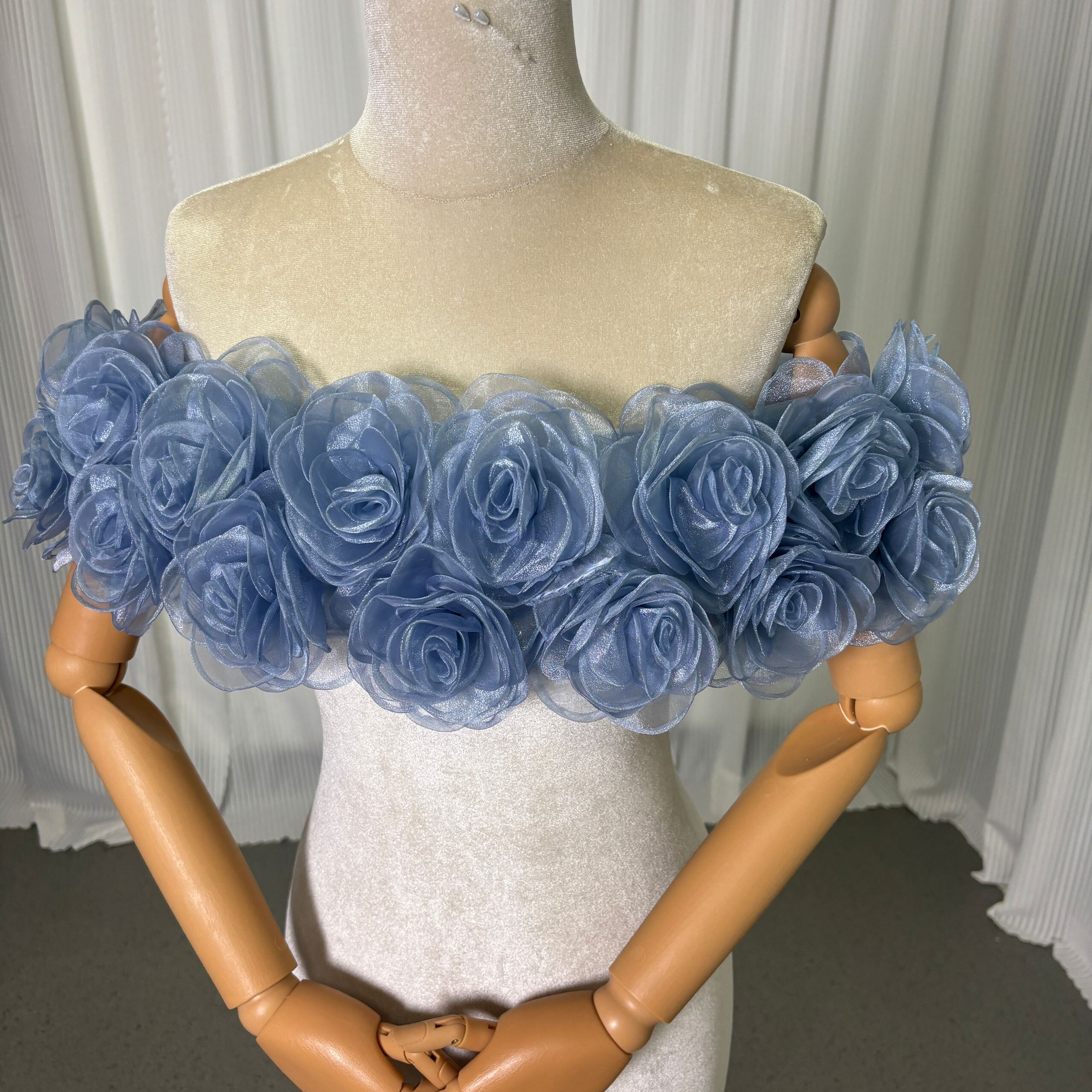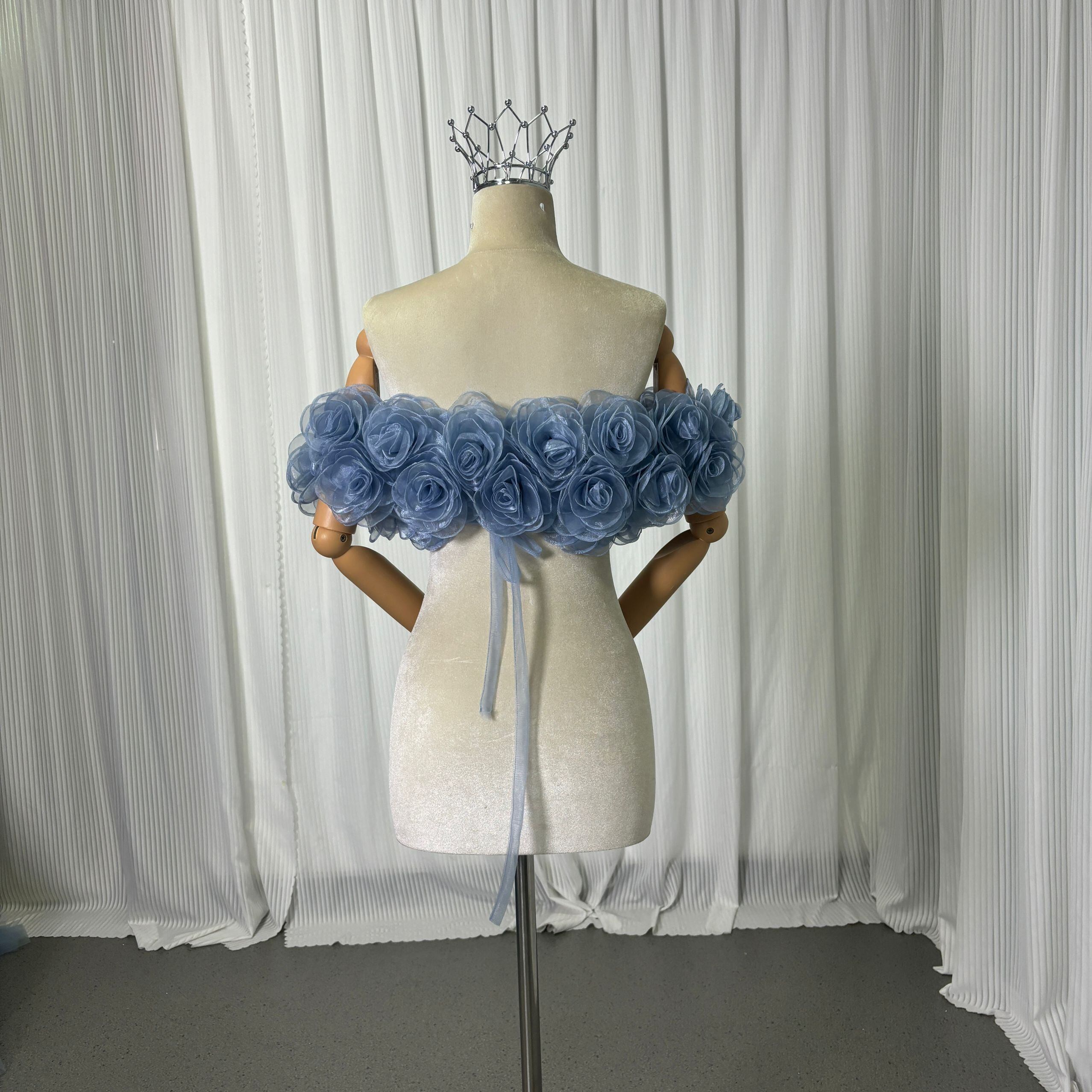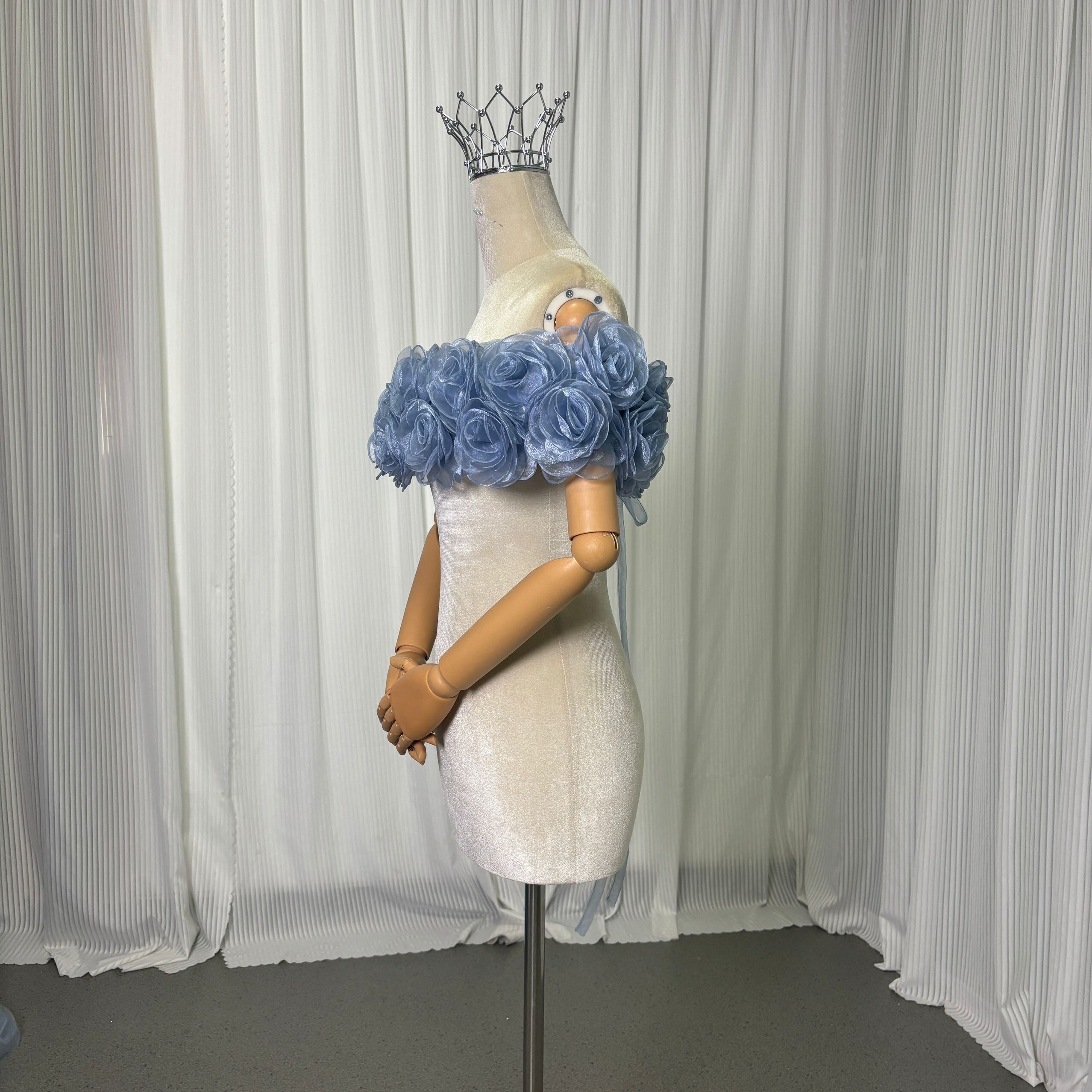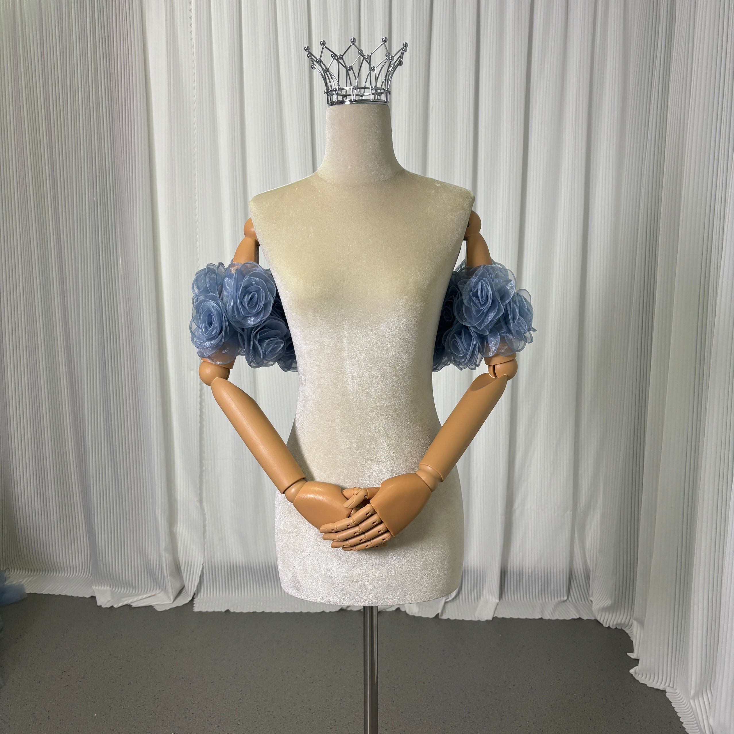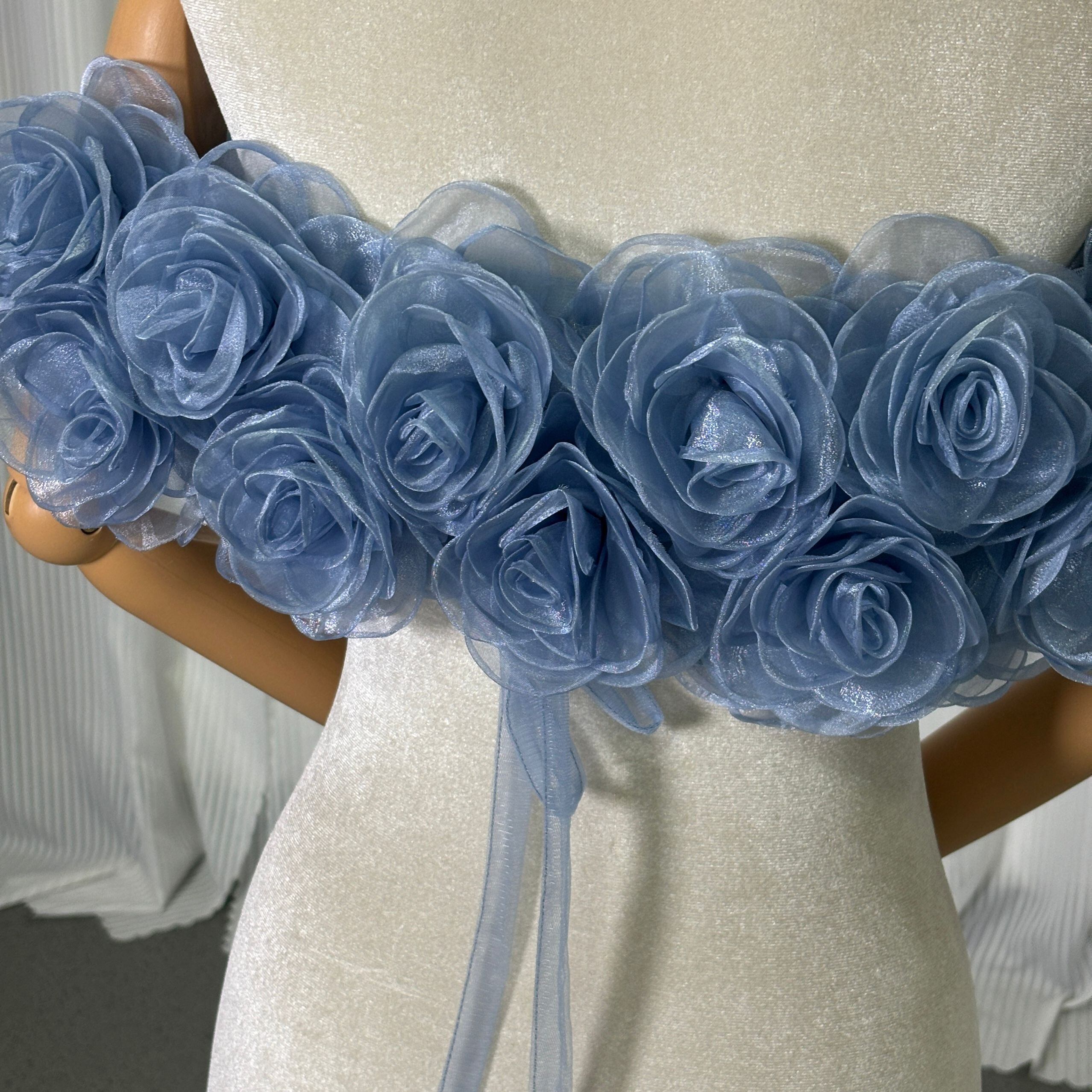 取り外し可能なオフショルダー ブルーグレー 上質オーガンジー にじゅう バラトレーン 編み上げ カラードレス