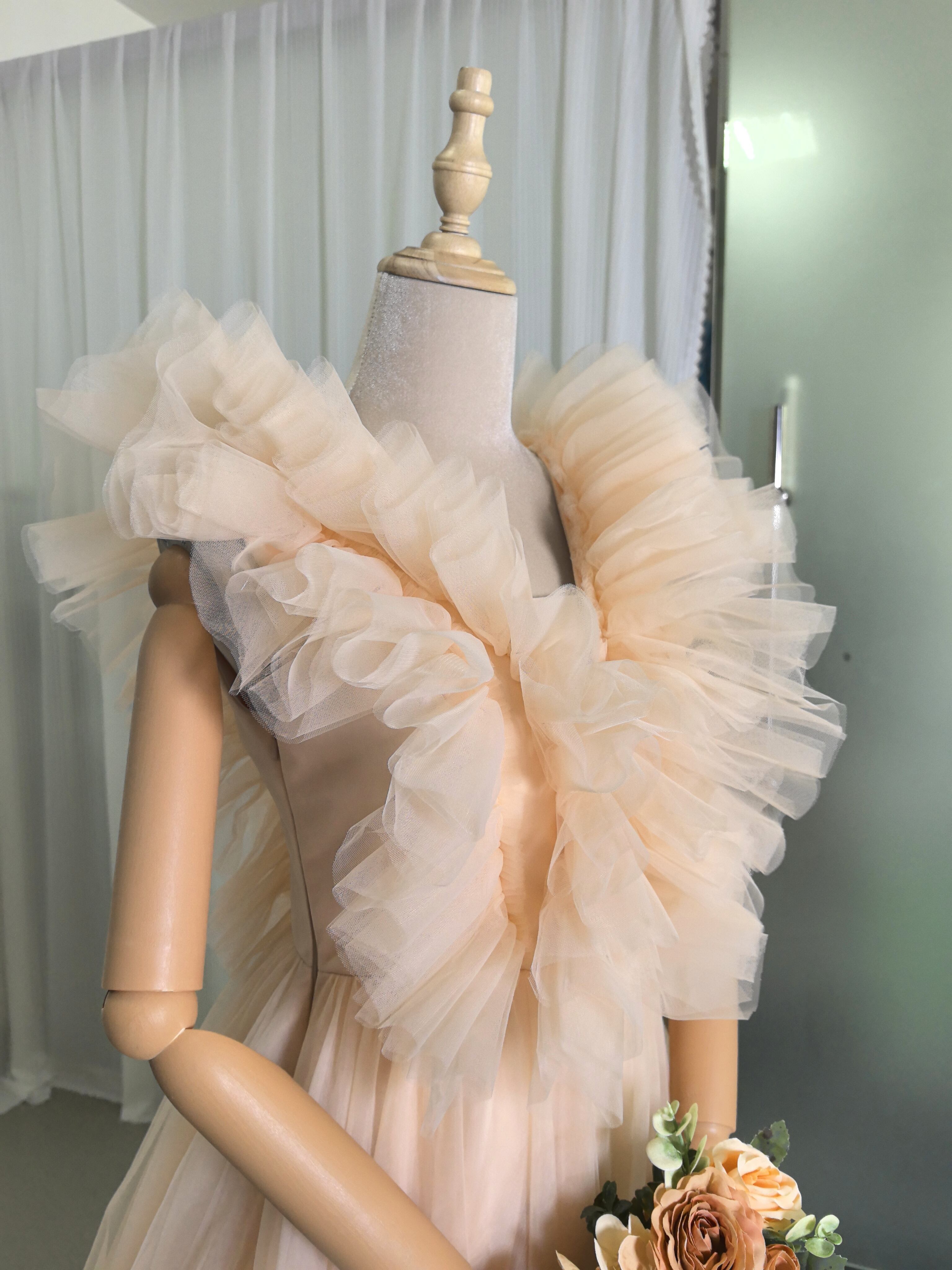 カラードレス シャンパン色 Vネック 柔らかく重ねたチュールスカート 優雅なシルエット 前撮り