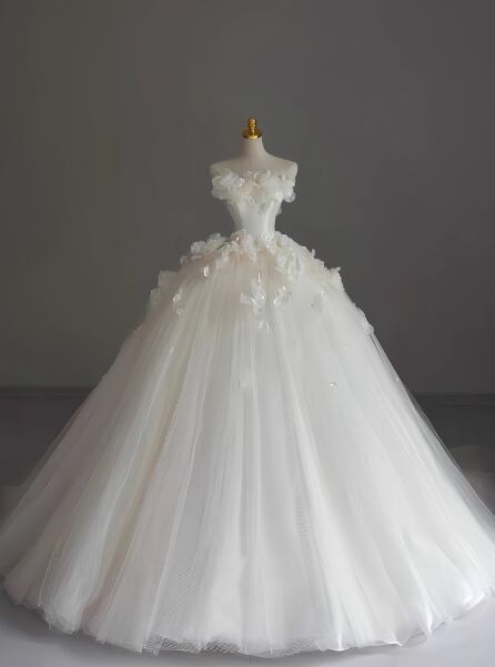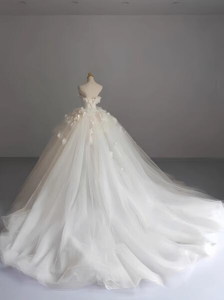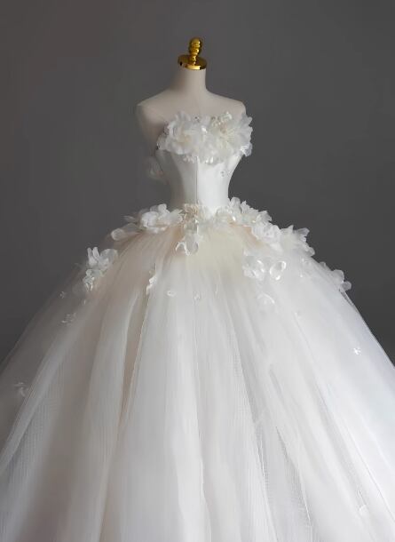 華やか ウェディングドレス ベアトップ 花柄のモチーフ刺繍が美しく ボリュームドレス 結婚式