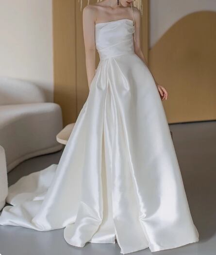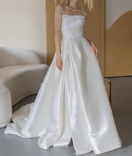 フランス風 ウェディングドレス ベアトップ 光沢サテン スリット 結婚式