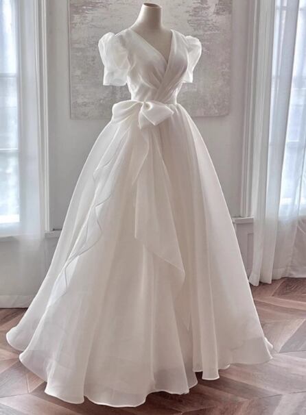 フランス風 パーティードレス Vネック 姫袖 リボン 揺らめく裾 披露宴