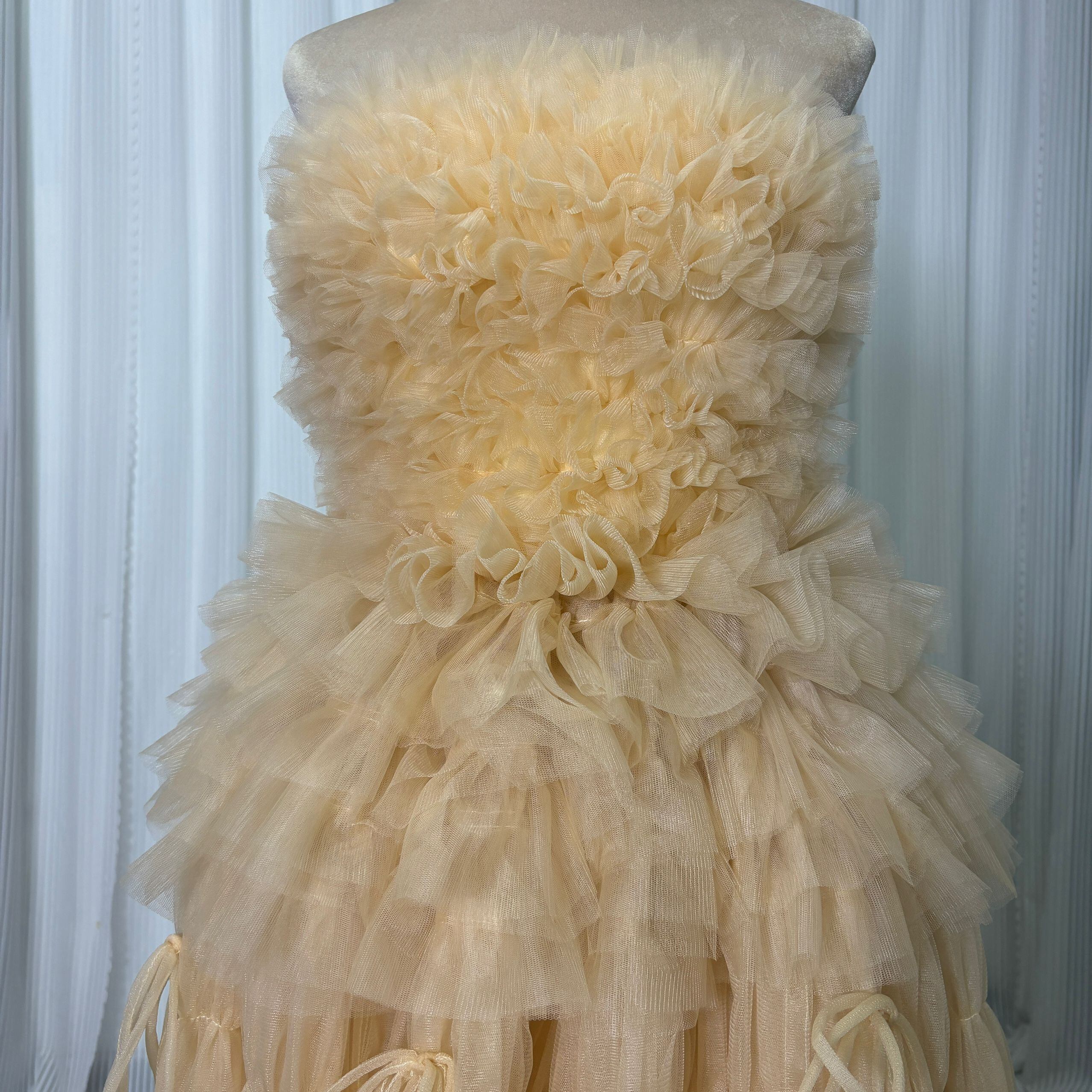 パーティードレス シャンパン色 ベアトップ リボン もこもこドレス 編み上げ 披露宴