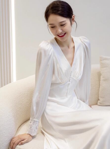 パーティードレス オフホワイト Vネック くるみボタン 背中見せ 繊細レース 2次会/合コン