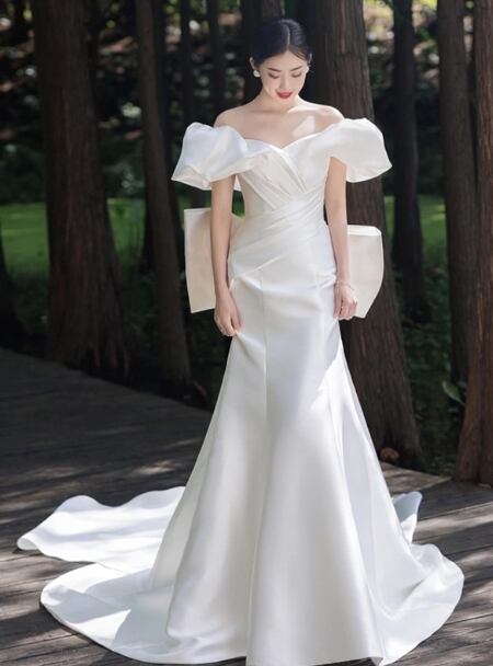 エレガント ウェディングドレス オフショルダー 豪華なバックリボン 細見えシルエット 編み上げ 披露宴