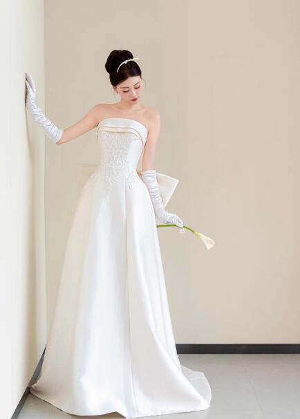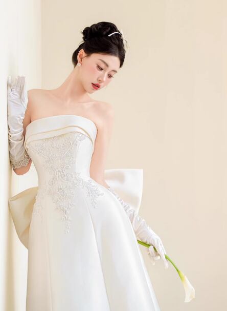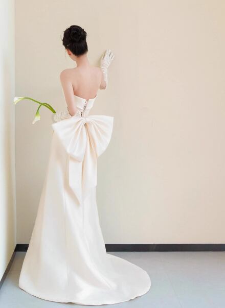 ウェディングドレス ベアトップ 豪華なバックリボン Aライン 繊細レース クラシカル 結婚式