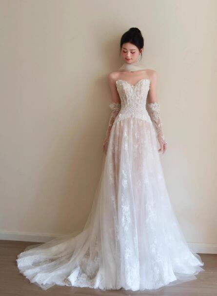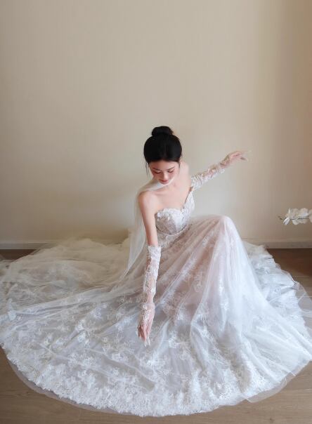 フランス風 ウェディングドレス ベアトップ 贅沢な小花総レース ふわふわドレス 拳式/前撮り