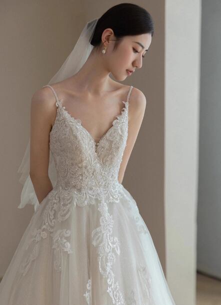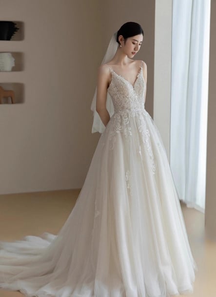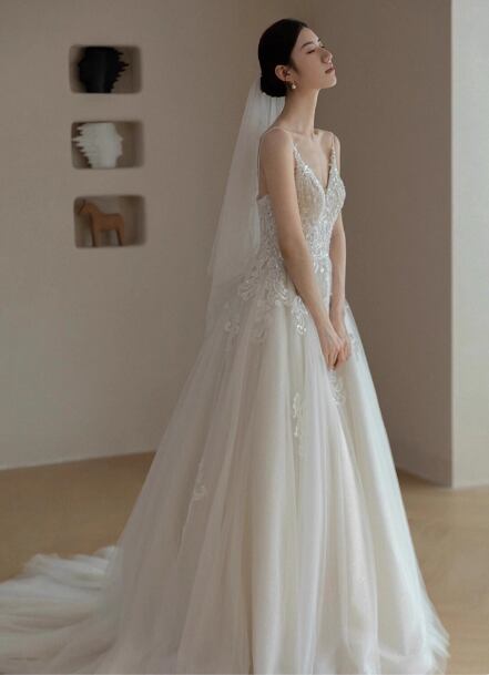 ウェディングドレス Vネック キャミソール キラキラ光る刺繍 チュールスカート 前撮り