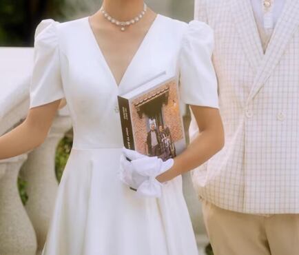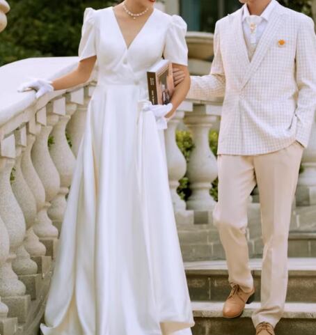 クラシカル ウェディングドレス 光沢サテン Vネックドレス 姫袖 大人っぽい 前撮り