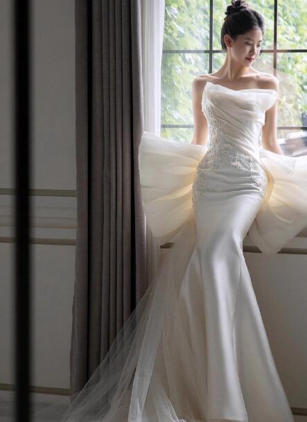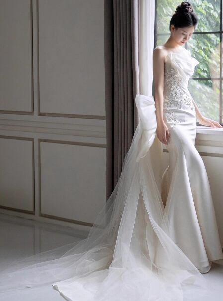 ウェディングドレス ベアトップ 魅惑の花レース マーメイドライン 豪華なバックリボン 結婚式