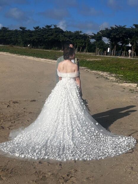 実例写真!ウエディングドレス ビーズ 花モチーフ 3D立体レース刺繍 可愛い 前撮り 優雅なシルエット