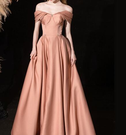 カラードレス カーキ色 オフショルダー 光沢サテン 編み上げ クラシカル 演奏会/音楽会