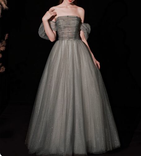 カラードレス グレー キラキラチュール ベアトップ パフスリーブ グリッタードレス Aライン 音楽会/発表会