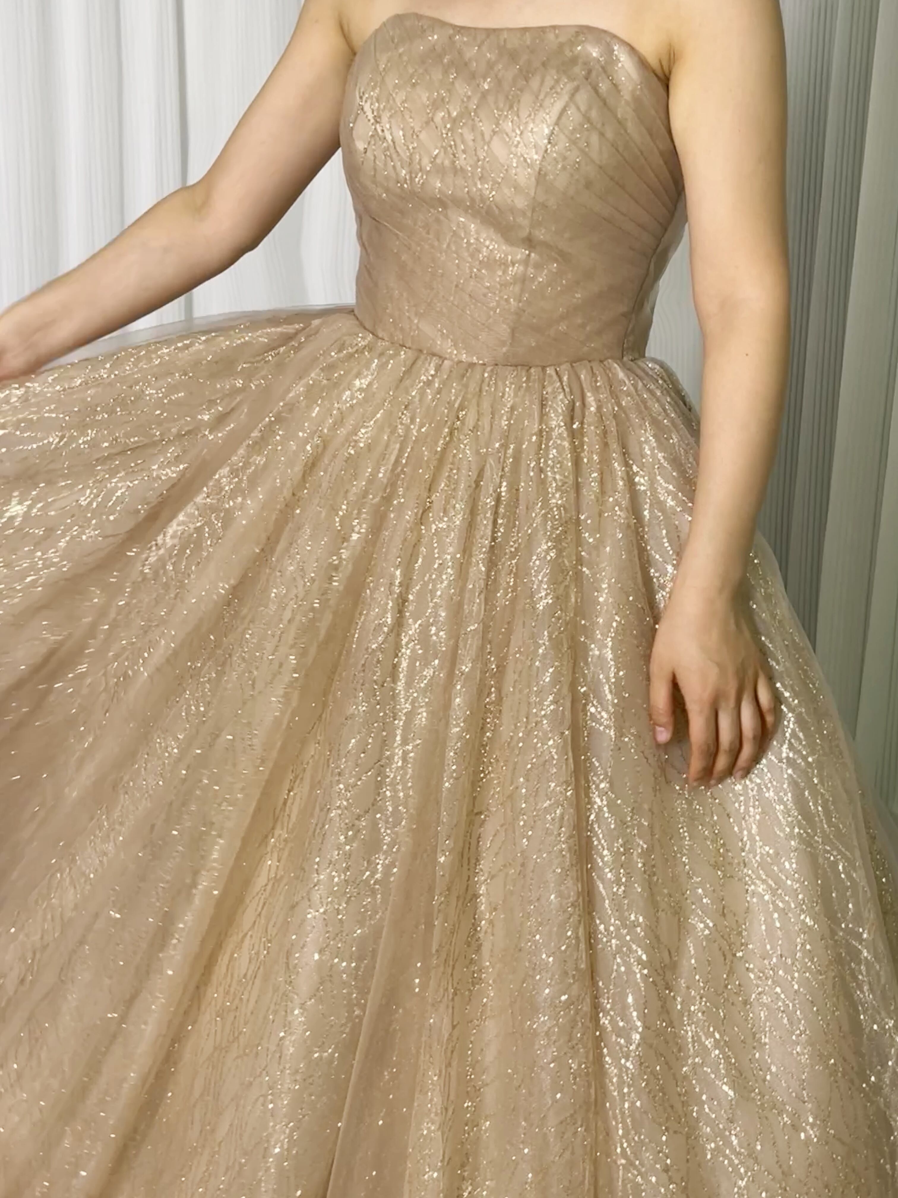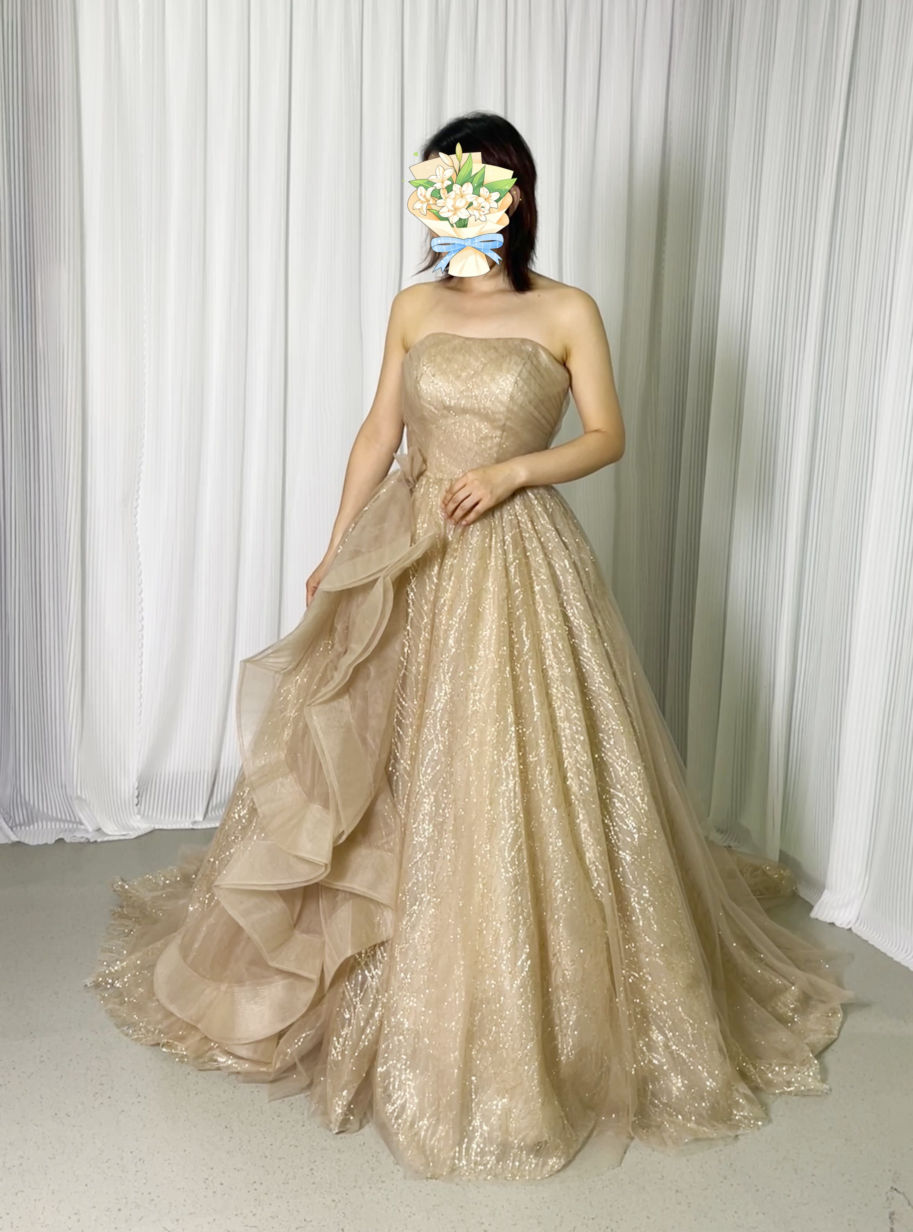 カラードレス 薄シャンパンの色 ベアトップ ラッフルフリル 編み上げ 抜群のおしゃれ見え 花嫁 前撮り