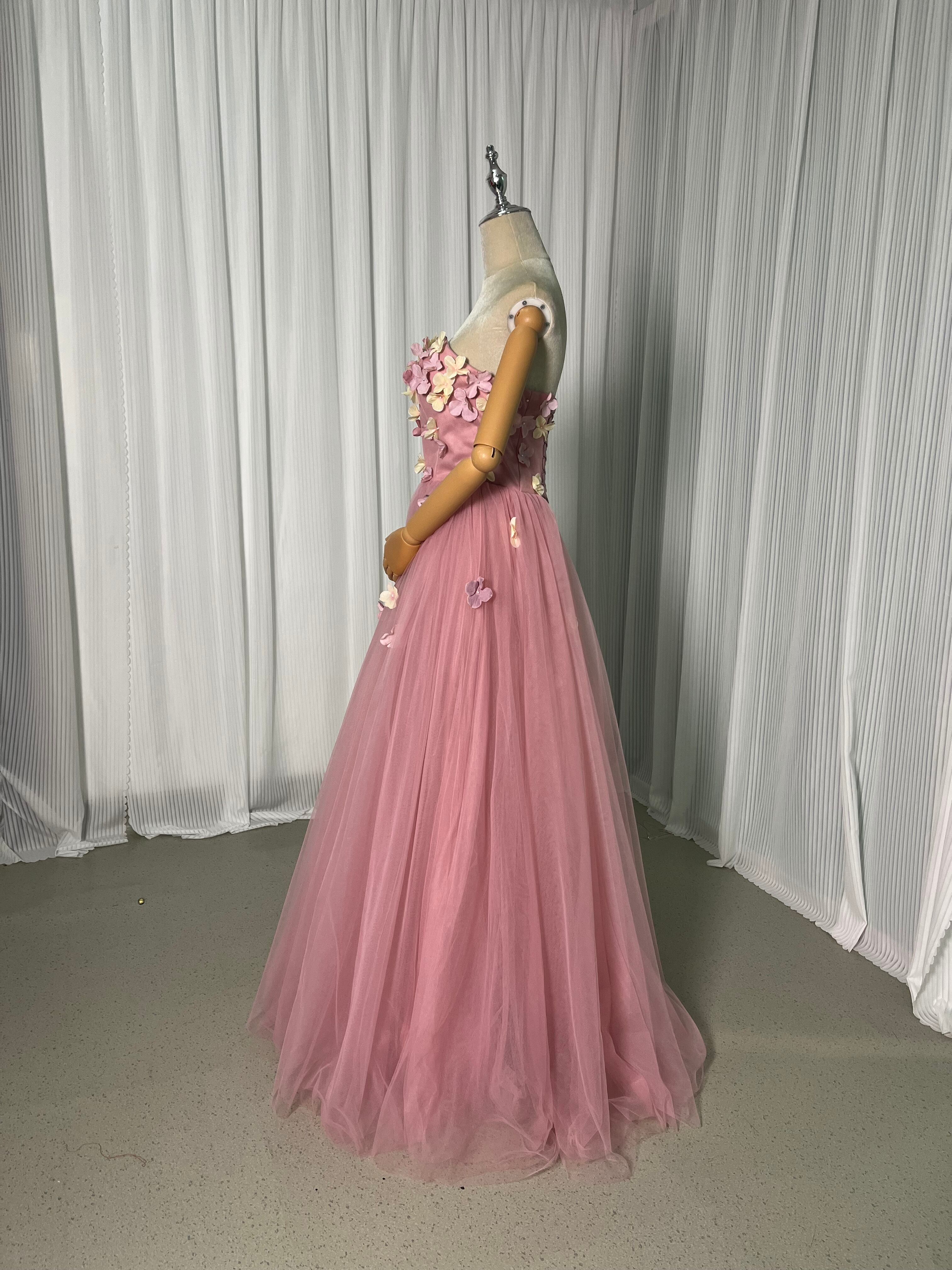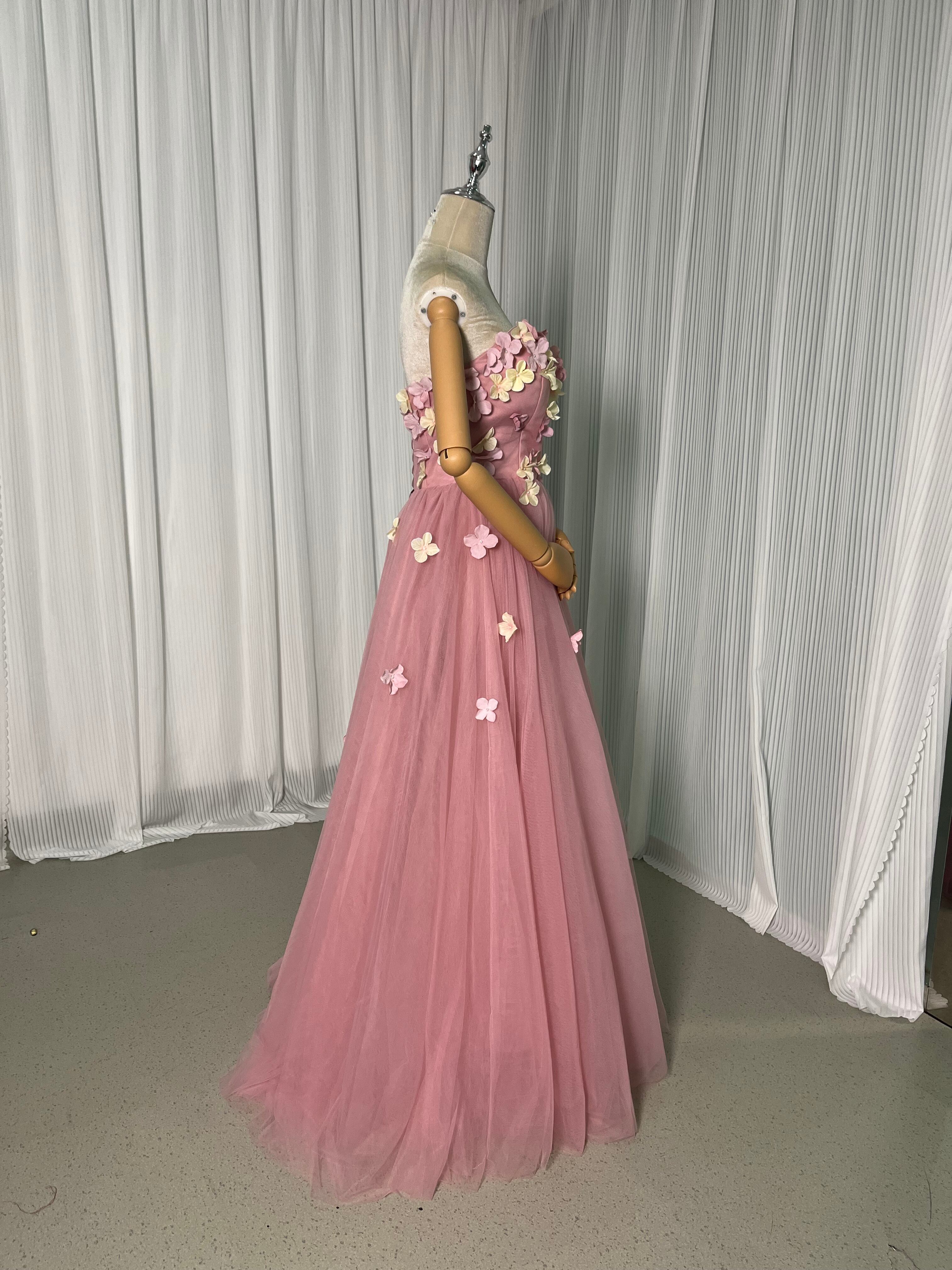 カラードレス ピンク ベアトップ チュールスカート 花モチーフ Aライン 編み上げ 披露宴 花嫁