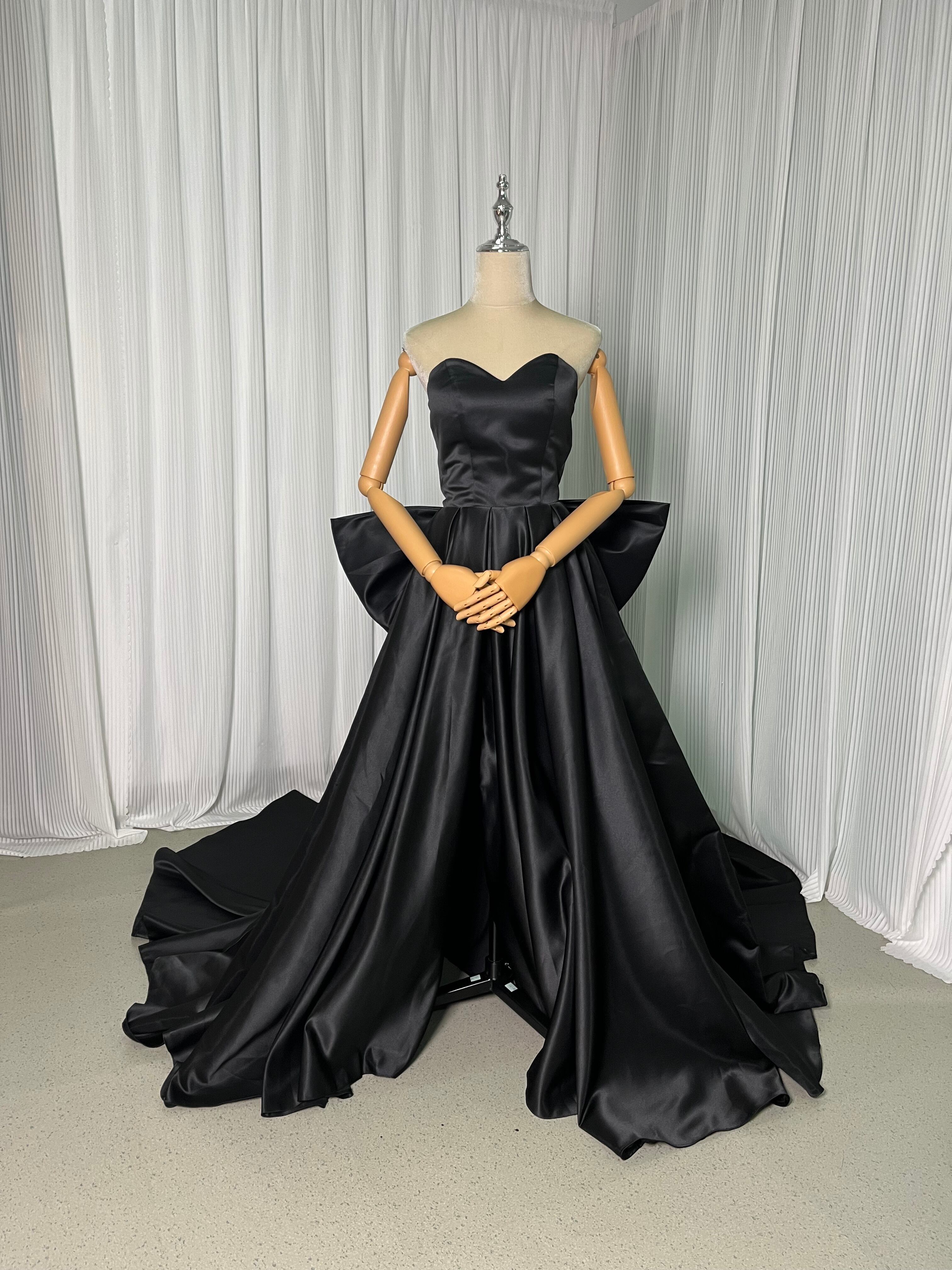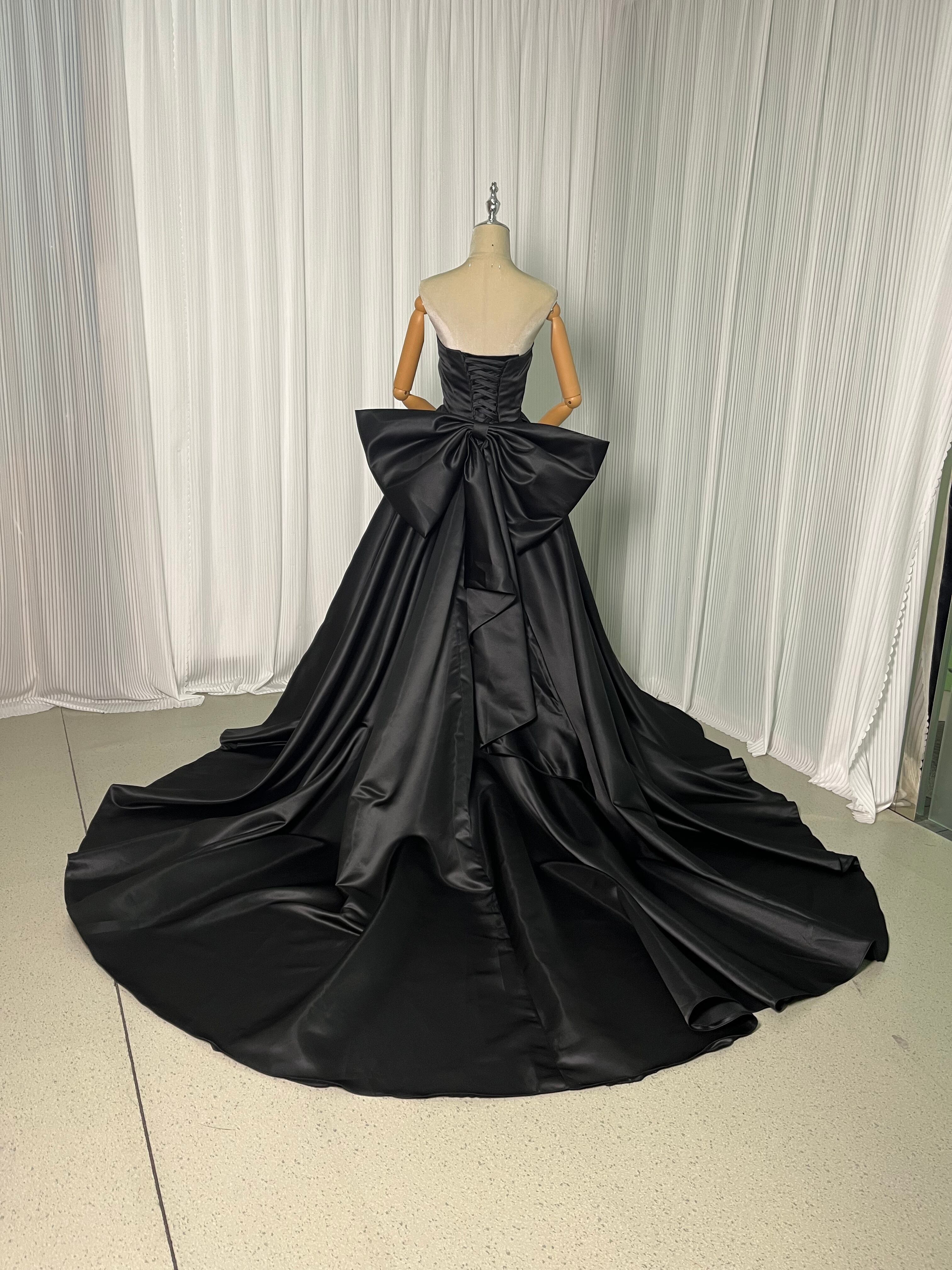 パーティードレス 黑 ベアトップ バックリボン 光沢サテン スリット ロングトレーン 披露宴 色直し
