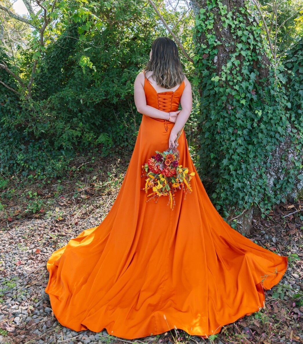 実例写真!キャミソール テラコッタ色 カラードレス 細見えシルエット 編み上げ 2次会 前撮り