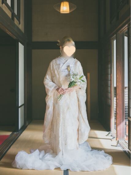 実例写真!打掛 着物 オーバードレス シャンパン色 ソフトチュール レース羽織 お色直し 精緻な刺繍