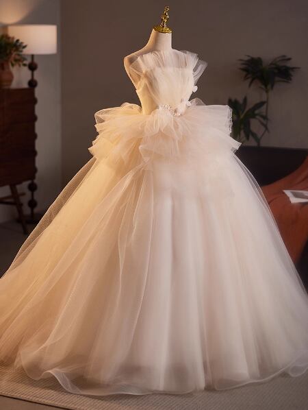 ウェディングドレス ベアトップ シャンパン色 ボリュームドレス ラッフルフリル 憧れのドレス 前撮り