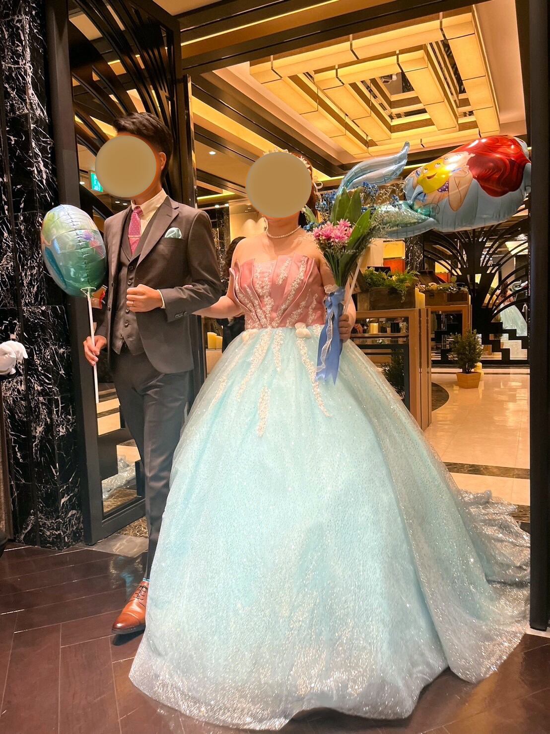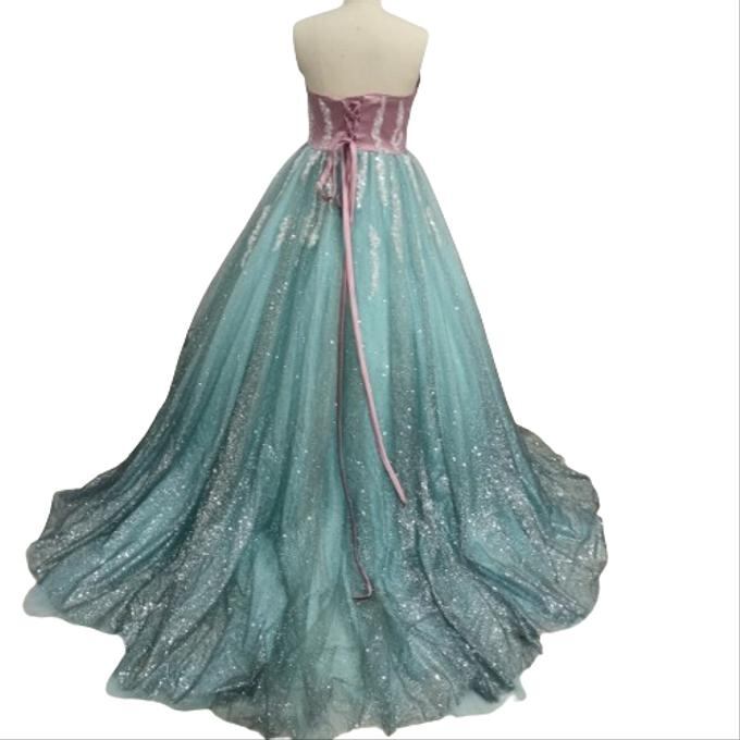 実例写真!華やか カラードレス ブルー ベアトップ キラキラチュール 3D立体レース刺繍 花嫁 プリンセスライン