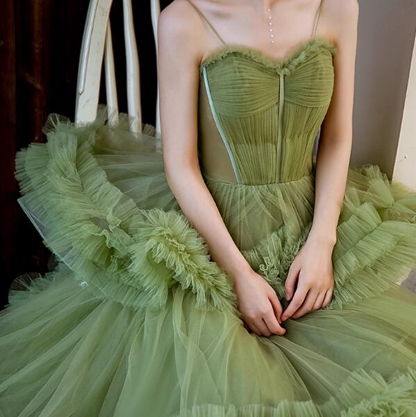 美品!カラードレス グリーン キャミソール 柔らかく重ねたチュールスカート 編み上げ 抜群のおしゃれ見え