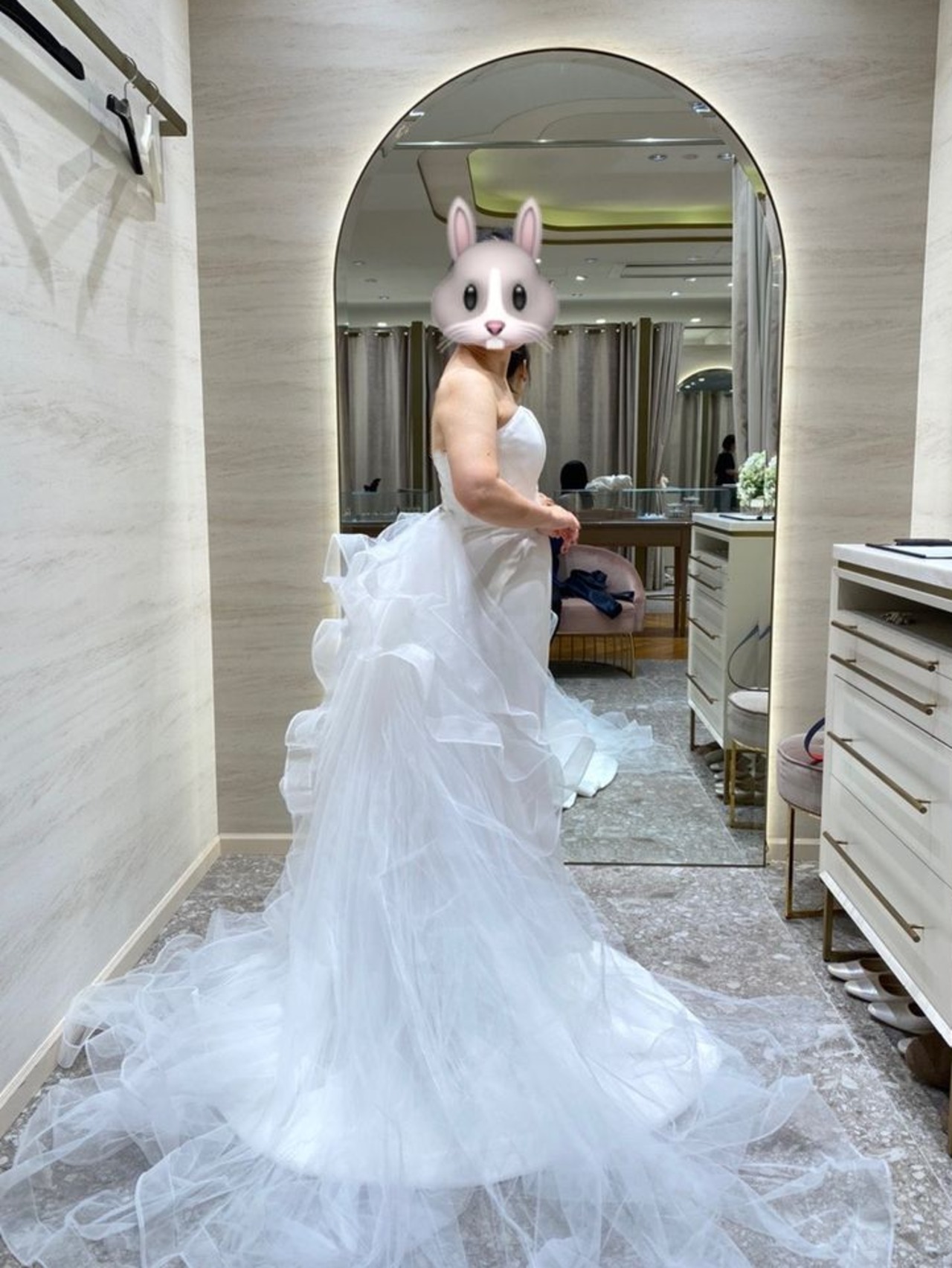 実例写真!華やかなトレーン オフホワイト ラッフルフリル 可愛い ソフトチュール 前撮り