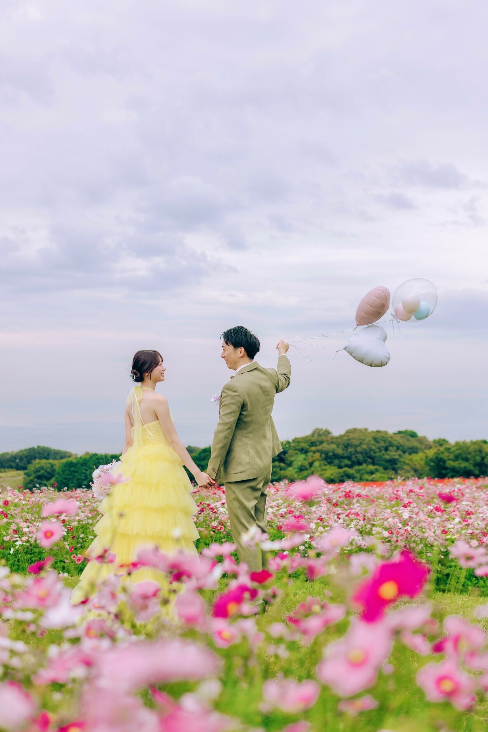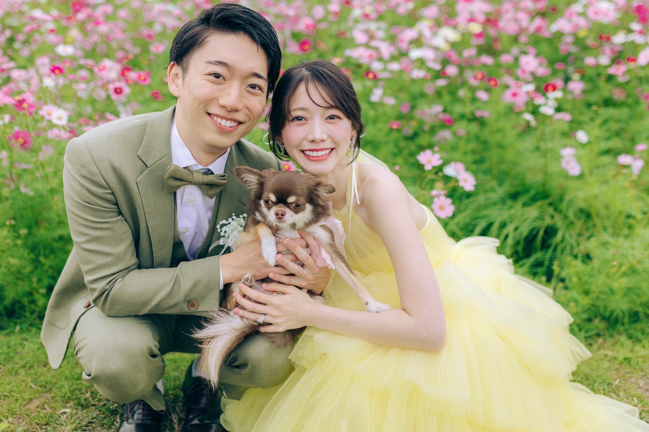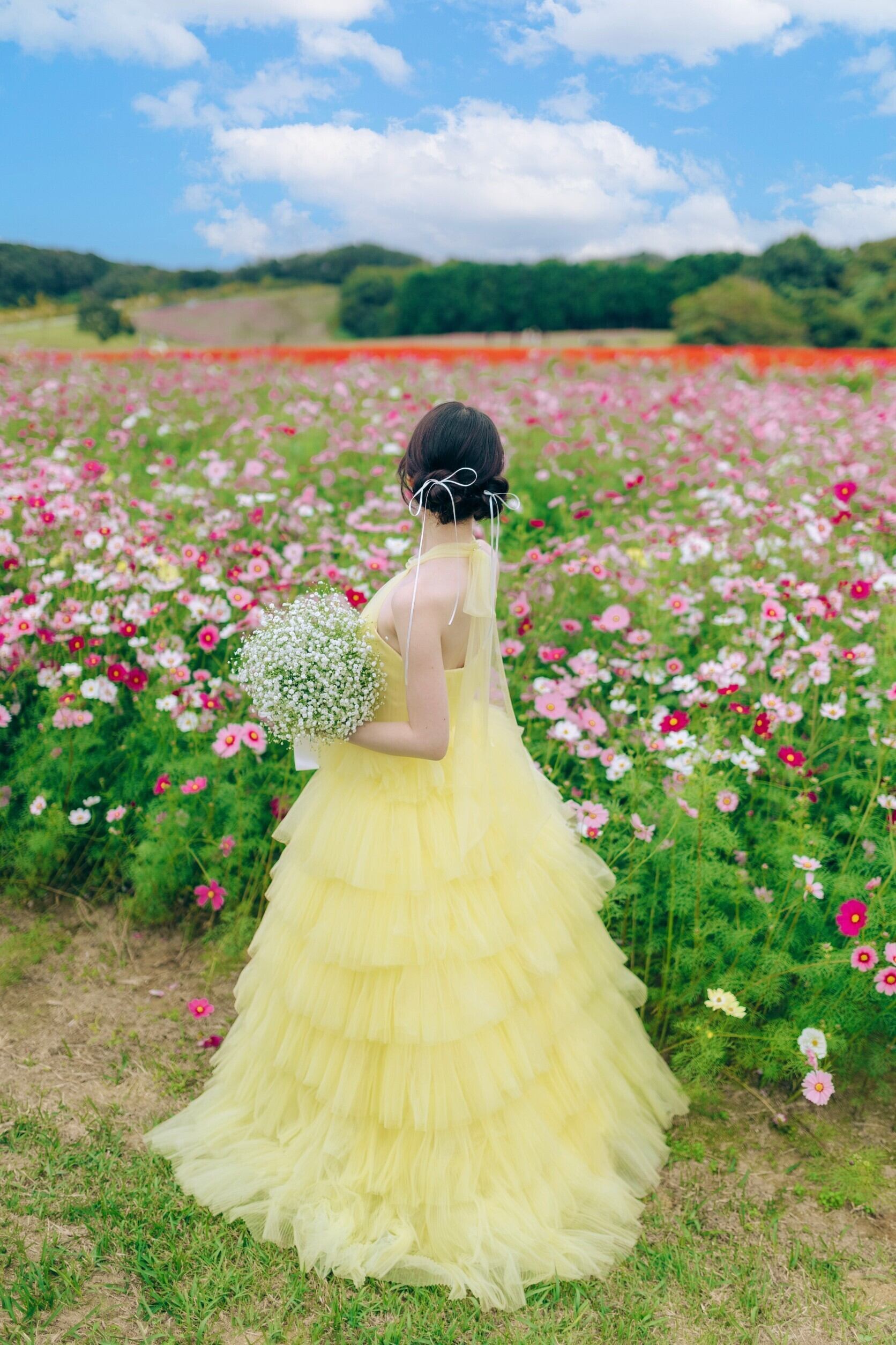 実例写真! レモンイエロー カラードレス プリーツ ホルターネック ソフトチュール 前撮り 可愛い