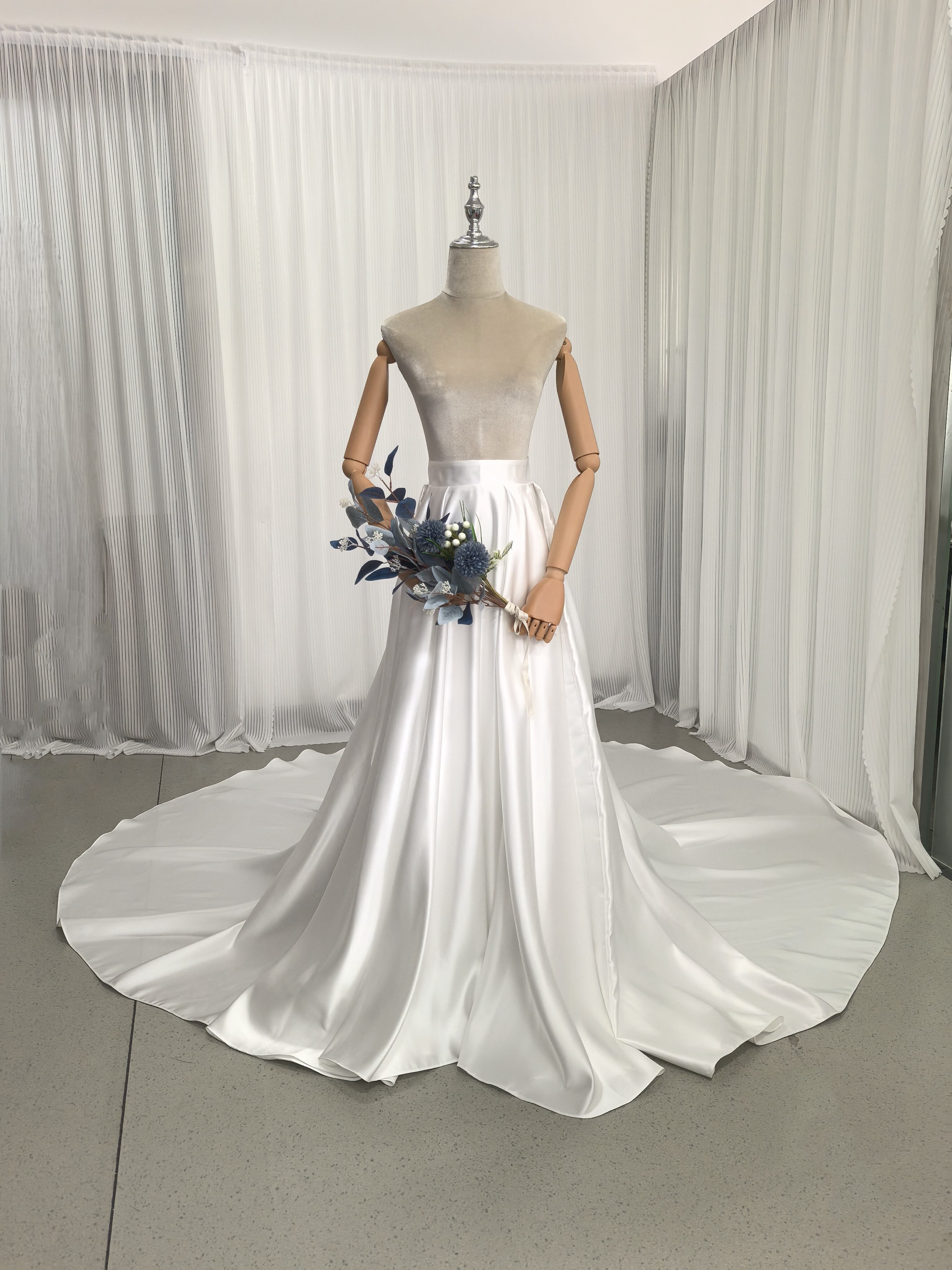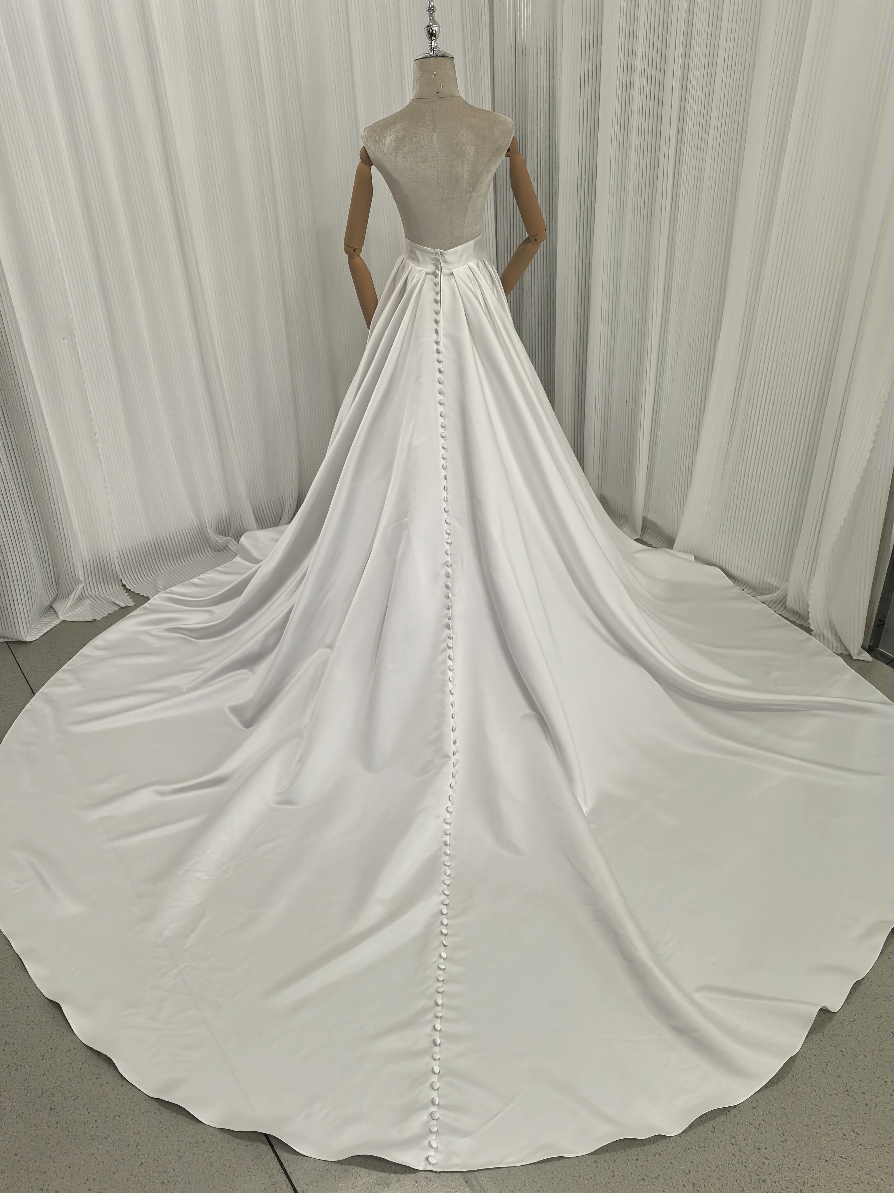 エレガント オーバースカート くるみボタン 光沢サテン オフホワイト ロングトレーン 色直し