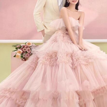 カラードレス ピンク ベアトップ 柔らかく重ねたチュールスカート 可愛い 前撮り 抜群のおしゃれ見え