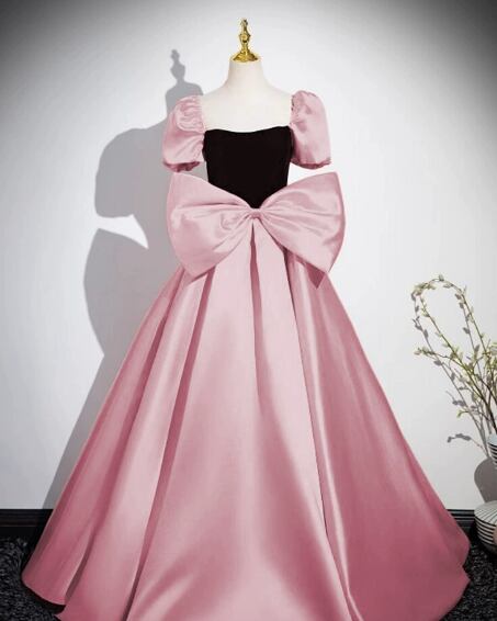 上品!カラードレス ピンク 黒 パフスリーブ 豪華なリボン 背中見せ 編み上げ 発表会
