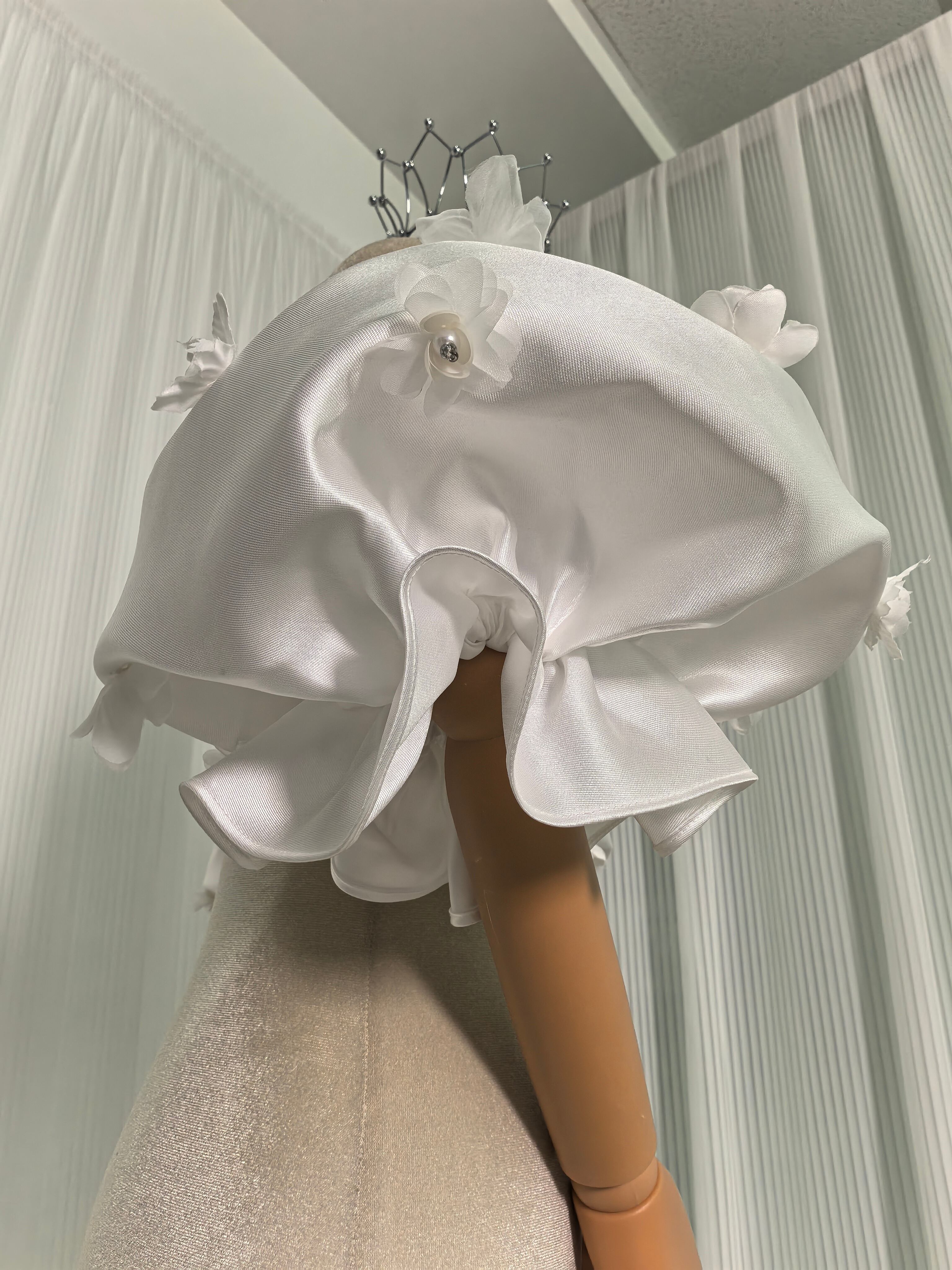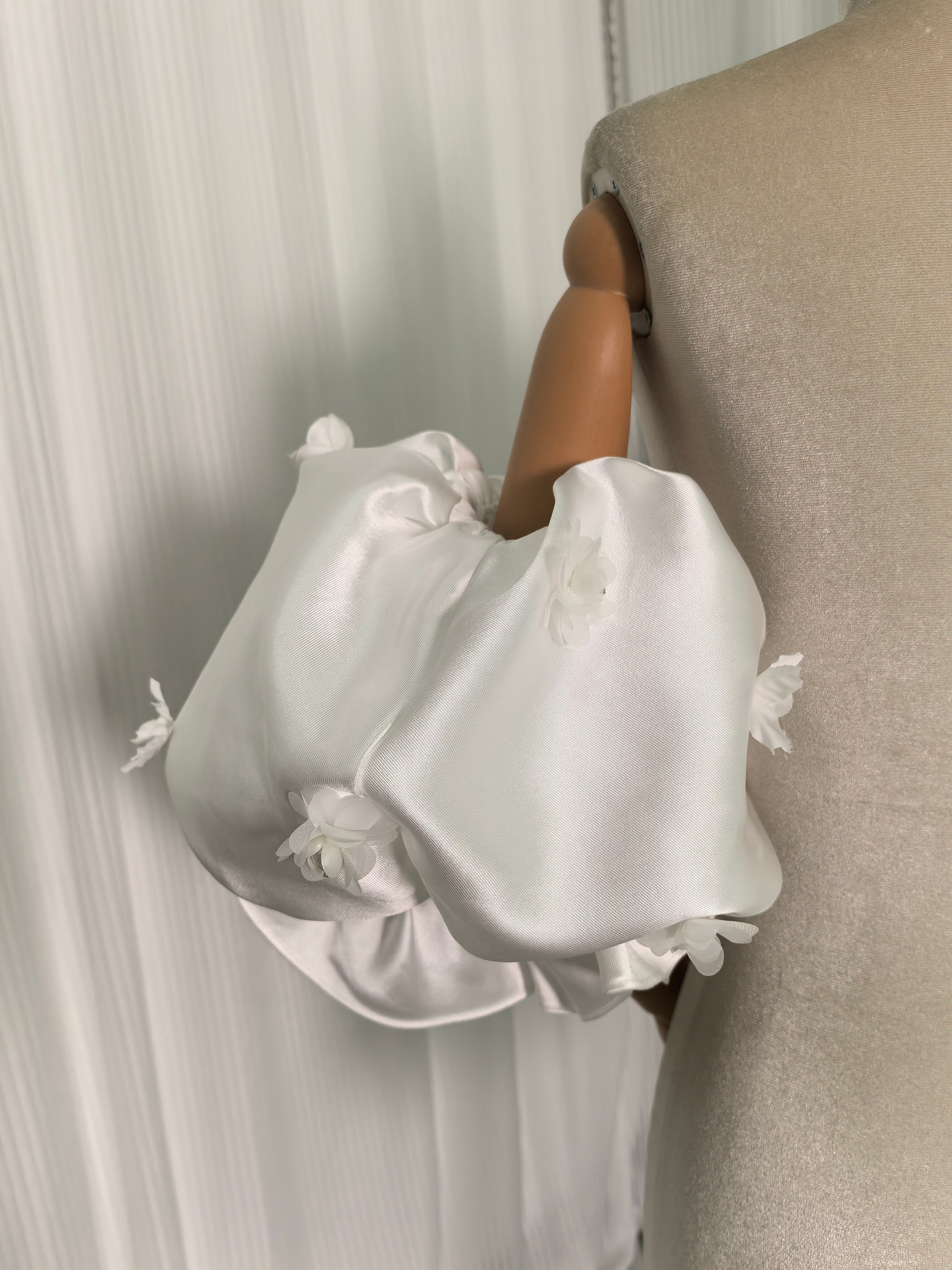パフスリーブ フリル袖 花モチーフ ストレッチ 可愛い オフホワイト 光沢感 前撮り 色直し