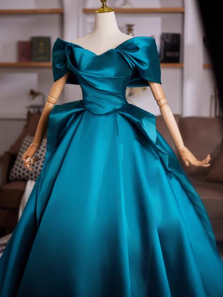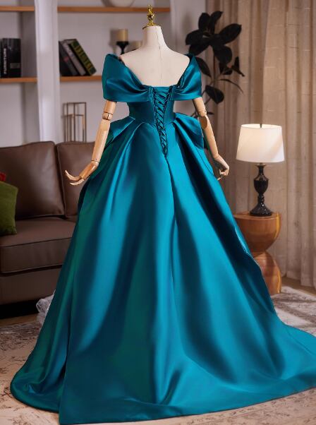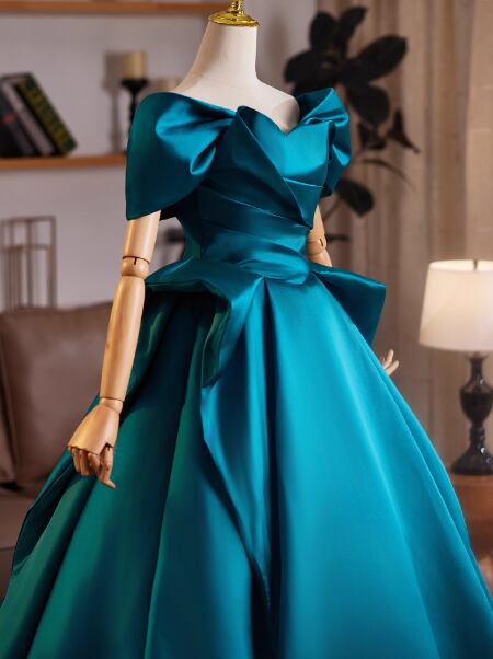 カラードレス ジュエルブルー 光沢サテン オフショルダー 編み上げ Aライン 披露宴
