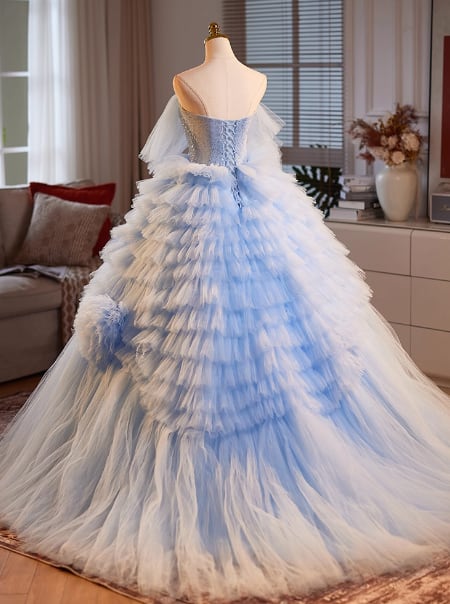 カラードレス ブルー ベアトップ ドロップショルダー もこもこドレス キラキラスパンコール 前撮り