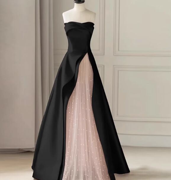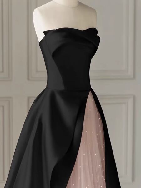 パーティードレス ブラック ピンク キラキラチュール フロントスリット Aライン 演奏会/音楽会