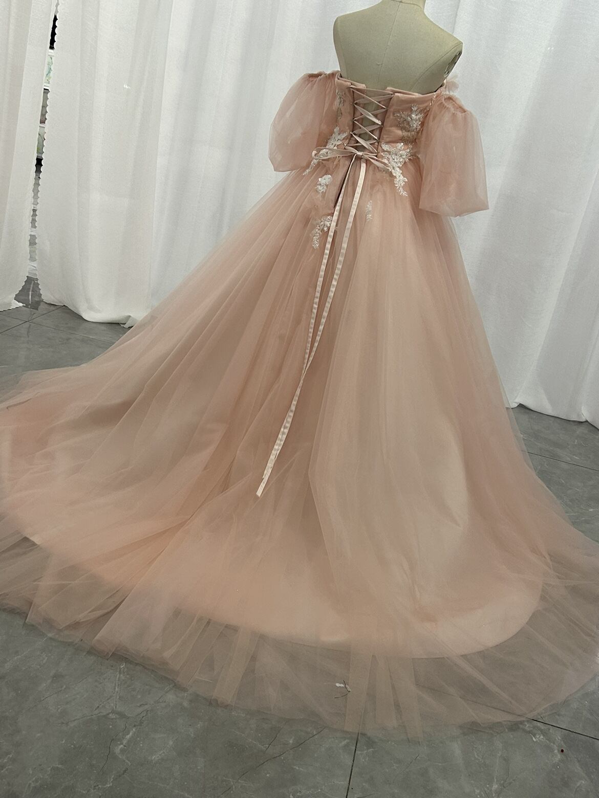 カラードレス 薄ピンク ベアトップ パフスリーブ チュールスカート 3D立体レース刺繍 花嫁 結婚式