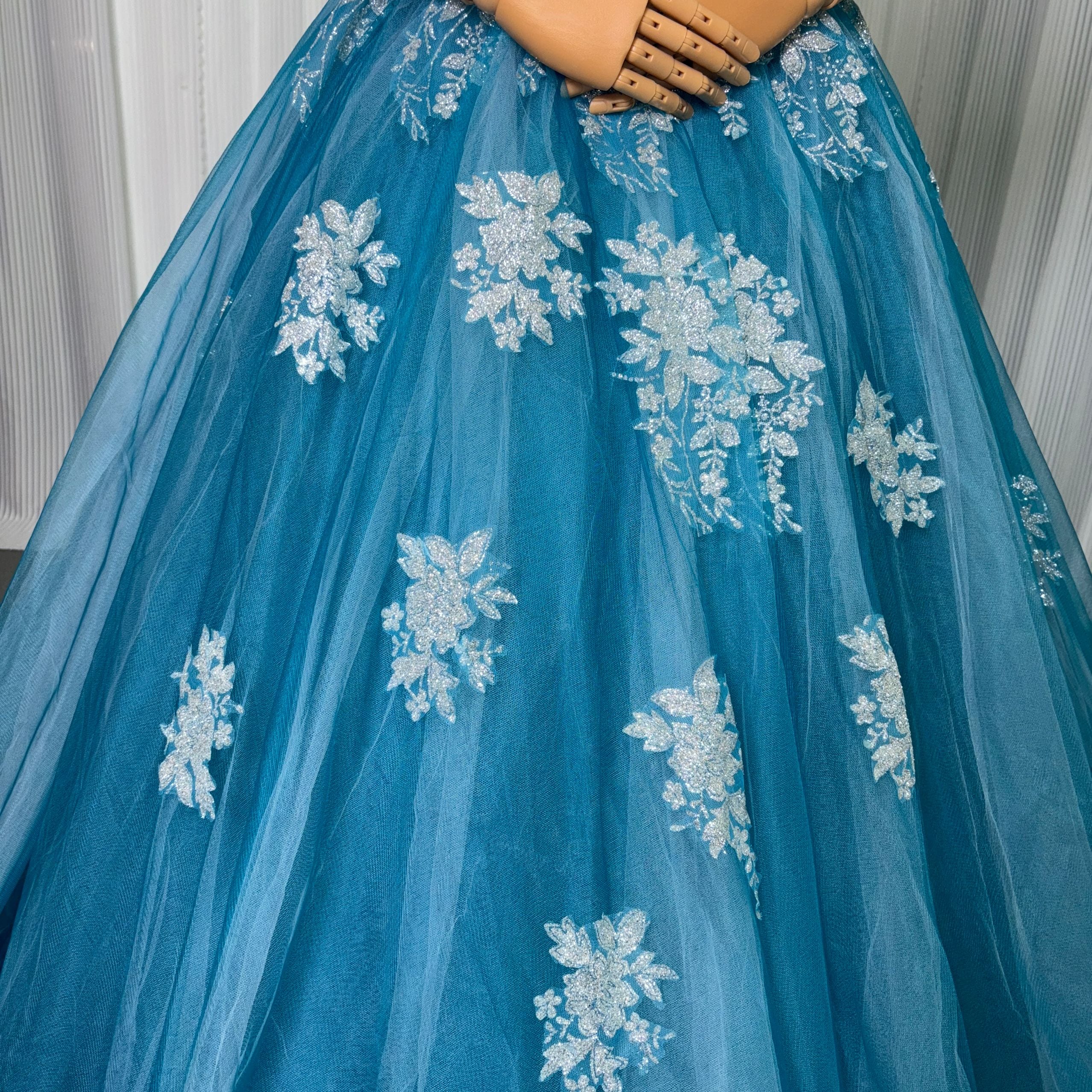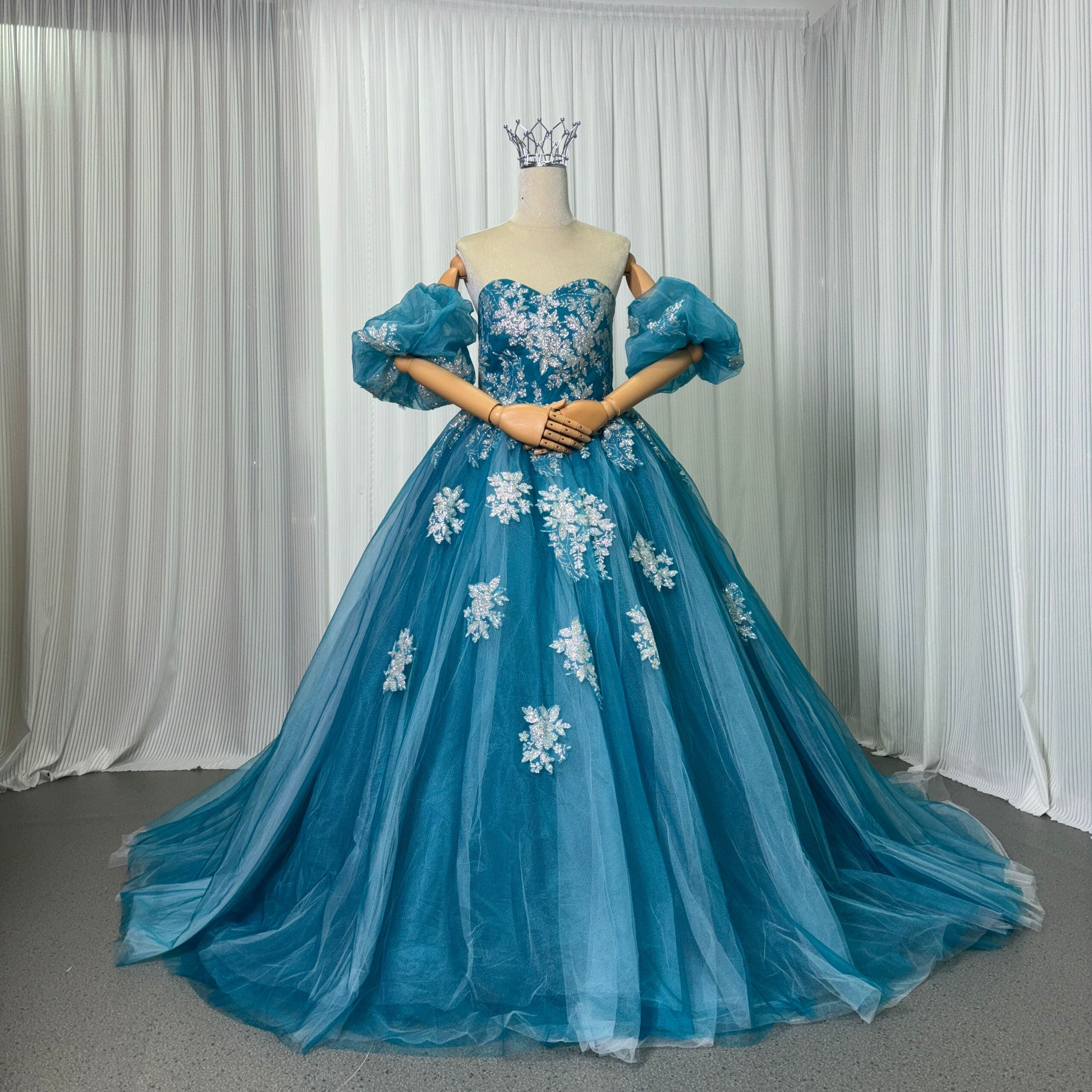 カラードレス ブルー ベアトップ キラキラ光る刺繍 パフスリーブ ソフトチュール 披露宴