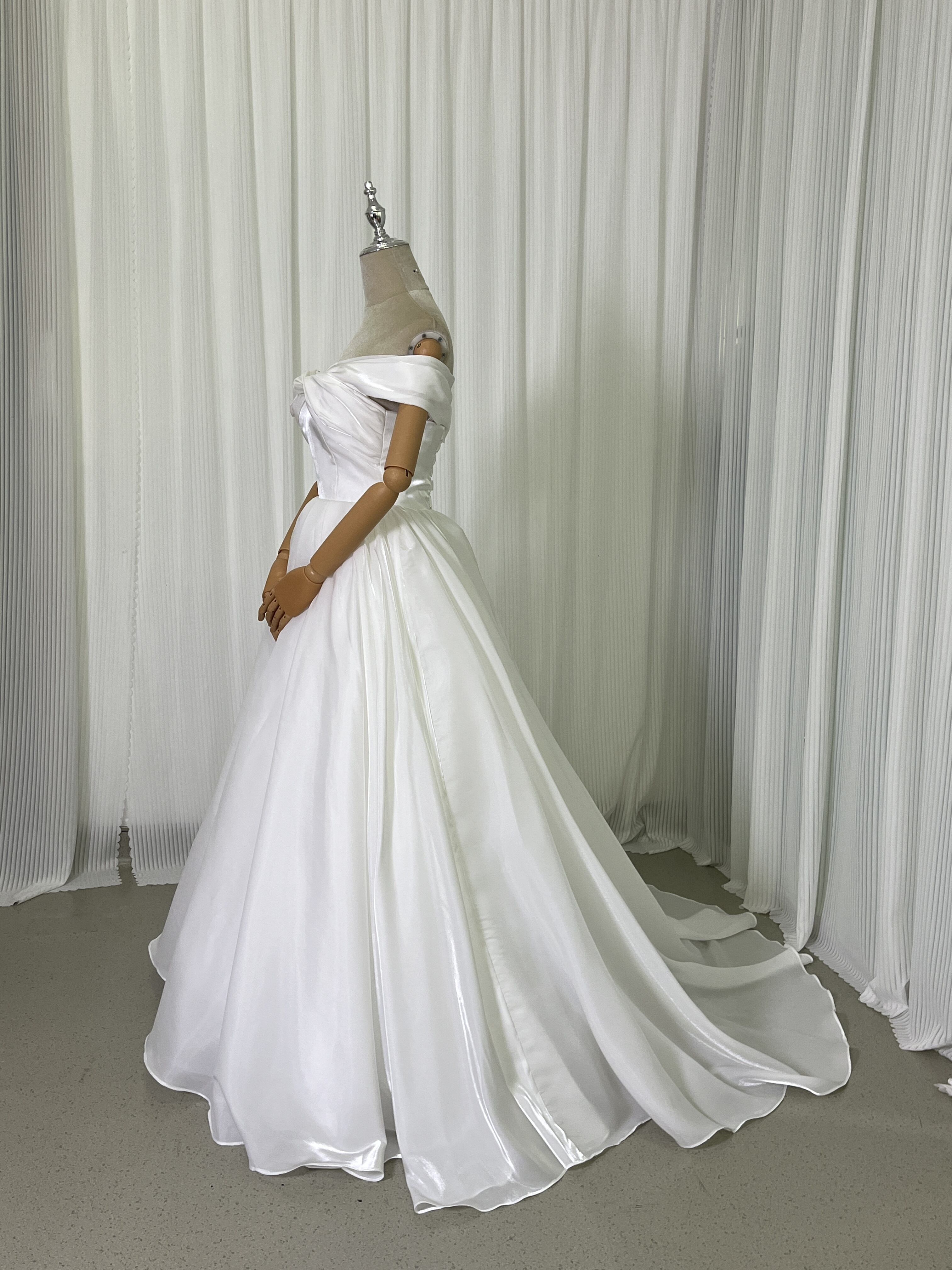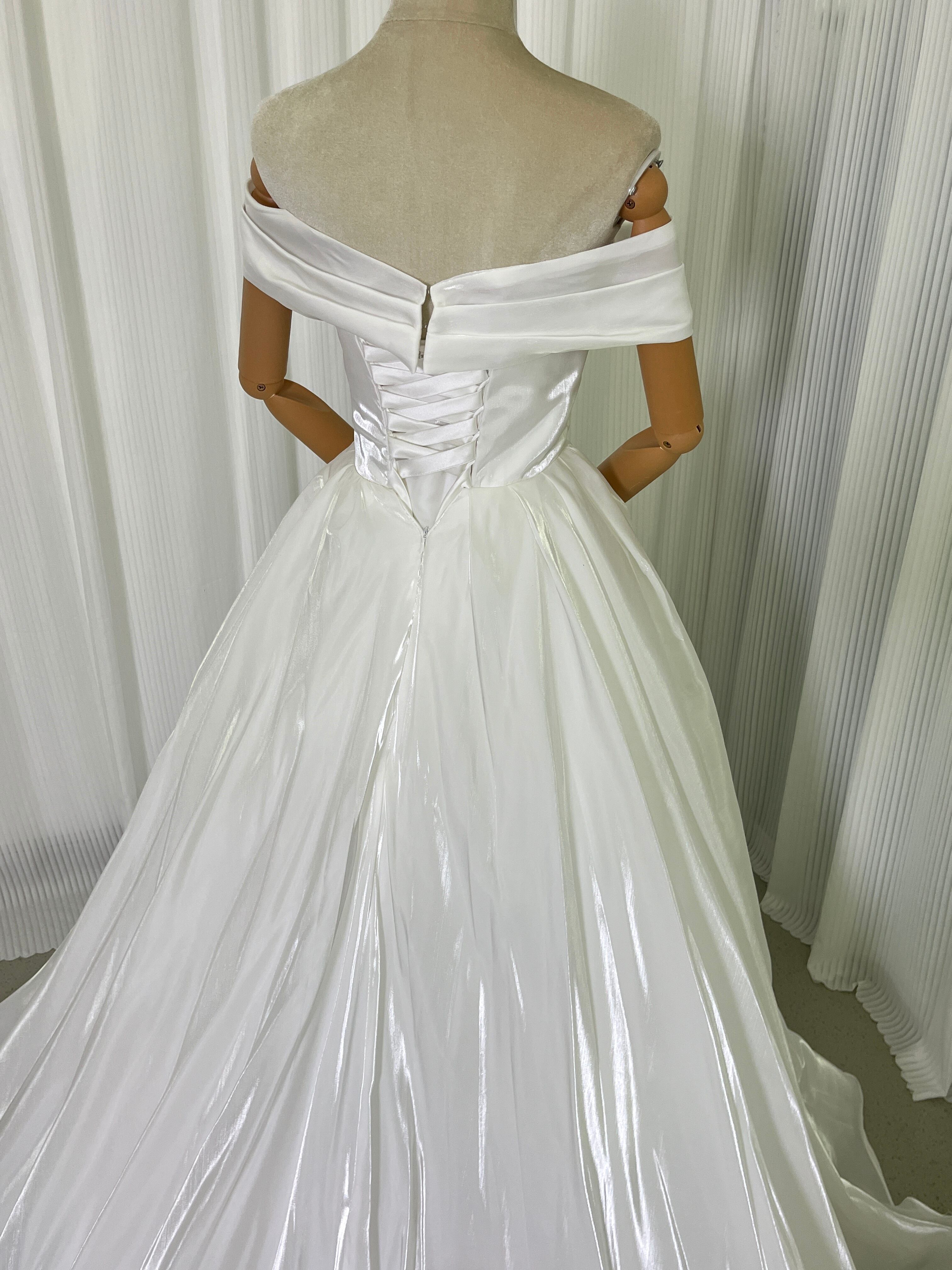 上品!ウェディングドレス オフショルダー 光沢感 快適な生地 編み上げ Aライン 披露宴