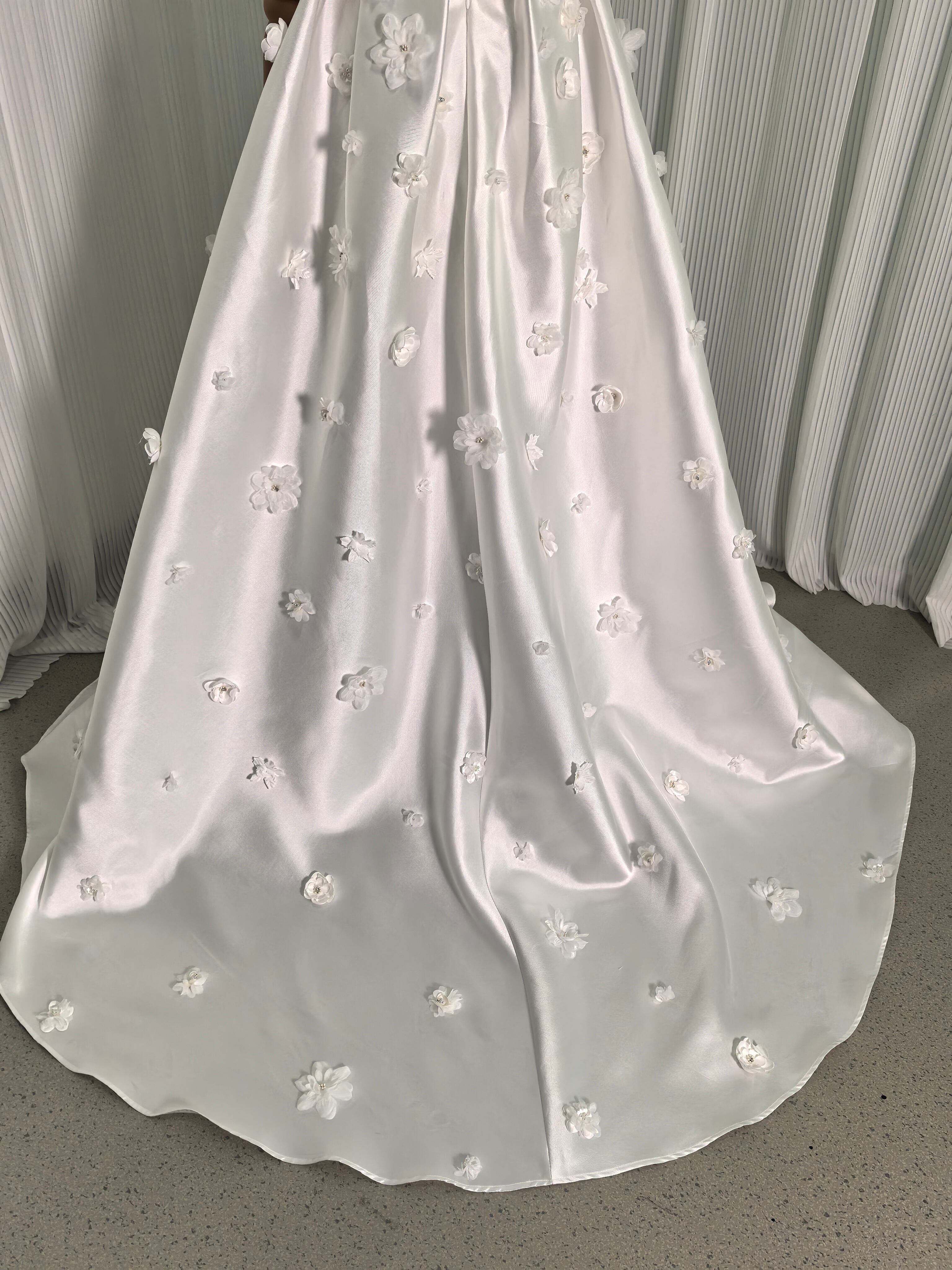 ウエディングドレス ベアトップ 可愛い 光沢サテン 花モチーフ ビーズ ファスナー 結婚式/披露宴