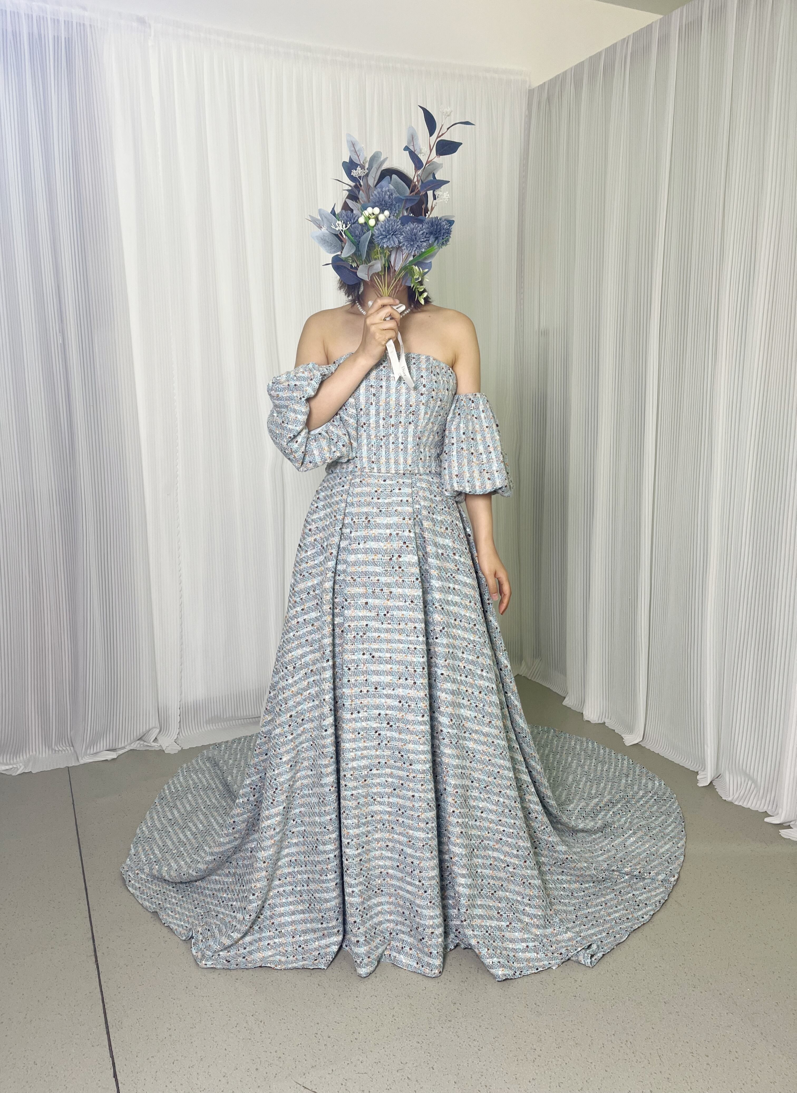 可愛い パーティードレス 爽やかで優しいブルー ツイードドレス 取り外し袖 編み上げ 前撮り